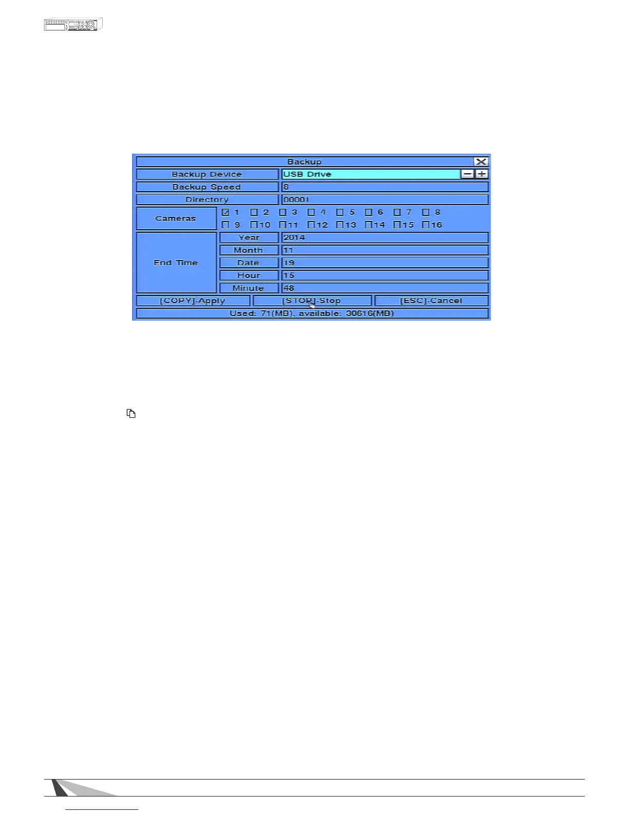 Press this button on the front panel of the DVR or on the remote control to start the backup (copy)