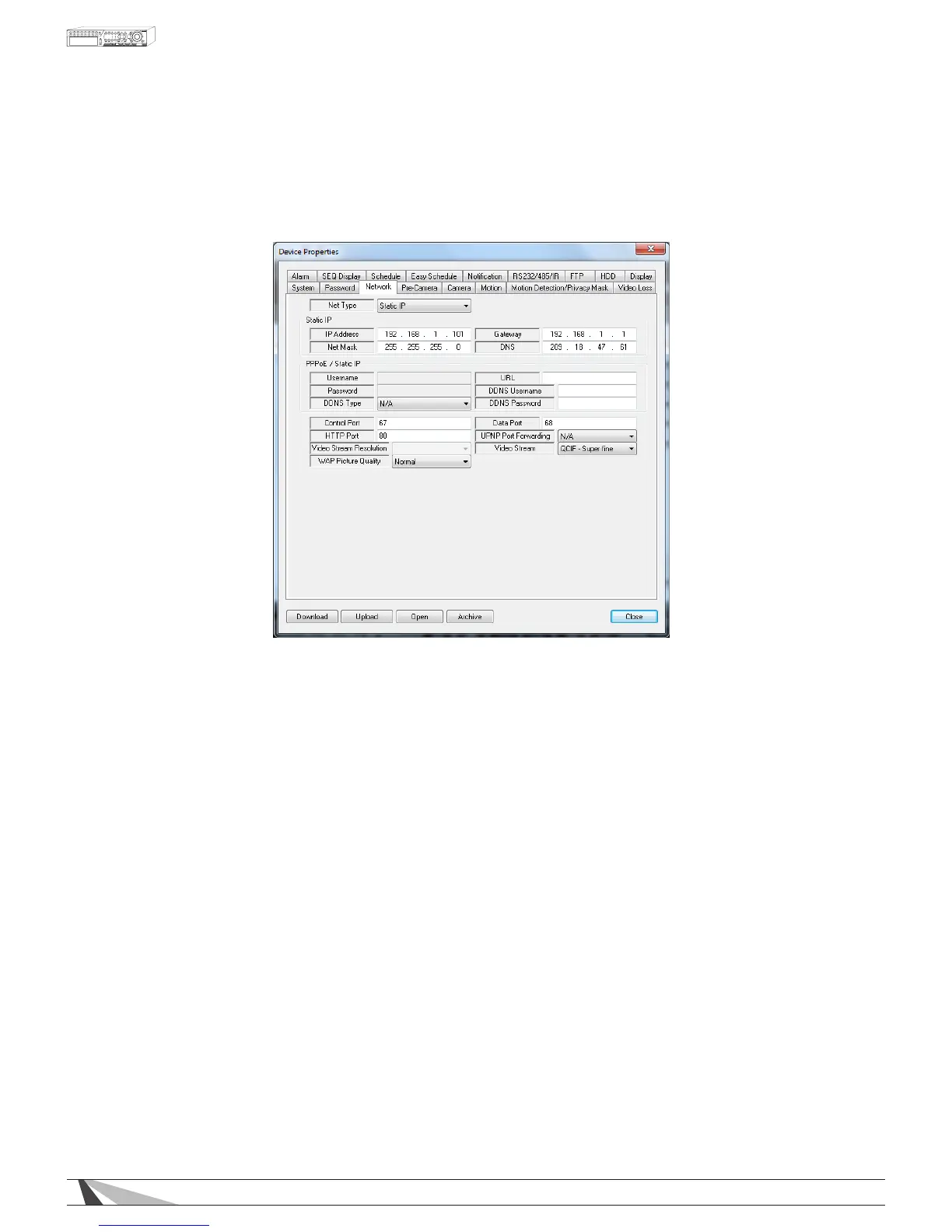 Select the type of network connection of the DVR to the network (DHCP, Static IP or PPPoE). DHCP is