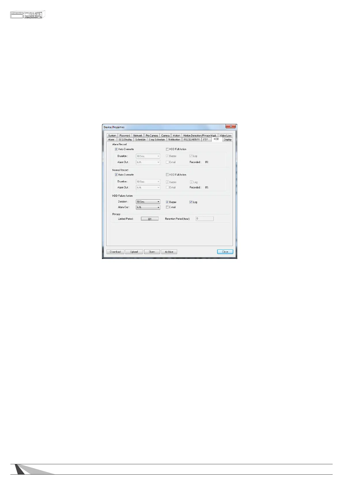 HDD Setup in Internet Explorer allows the administrator to dene the behavior for Alarm Record and Normal