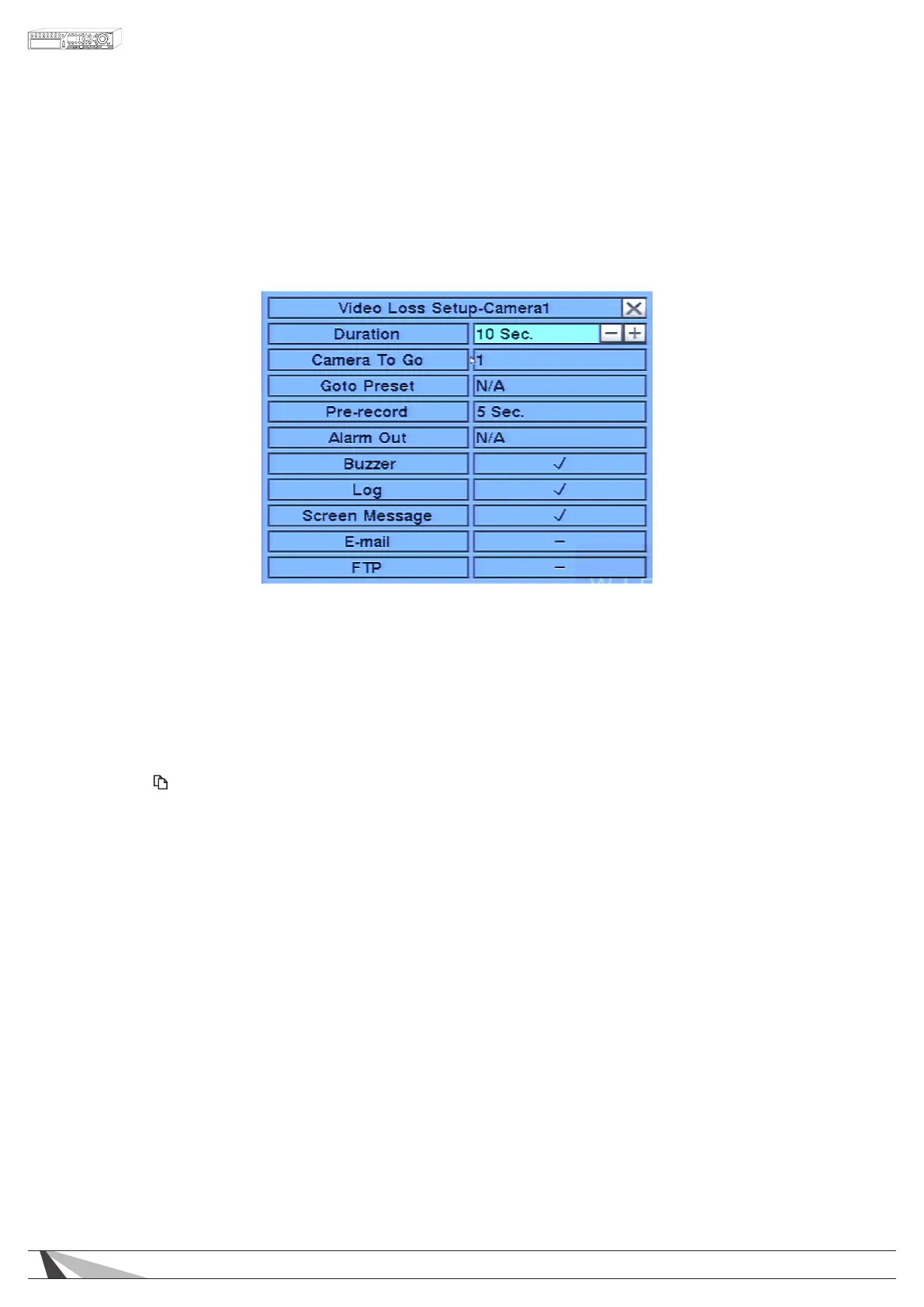 of the DVR or remote control to display Video Loss Setup sub menu for the selected camera.