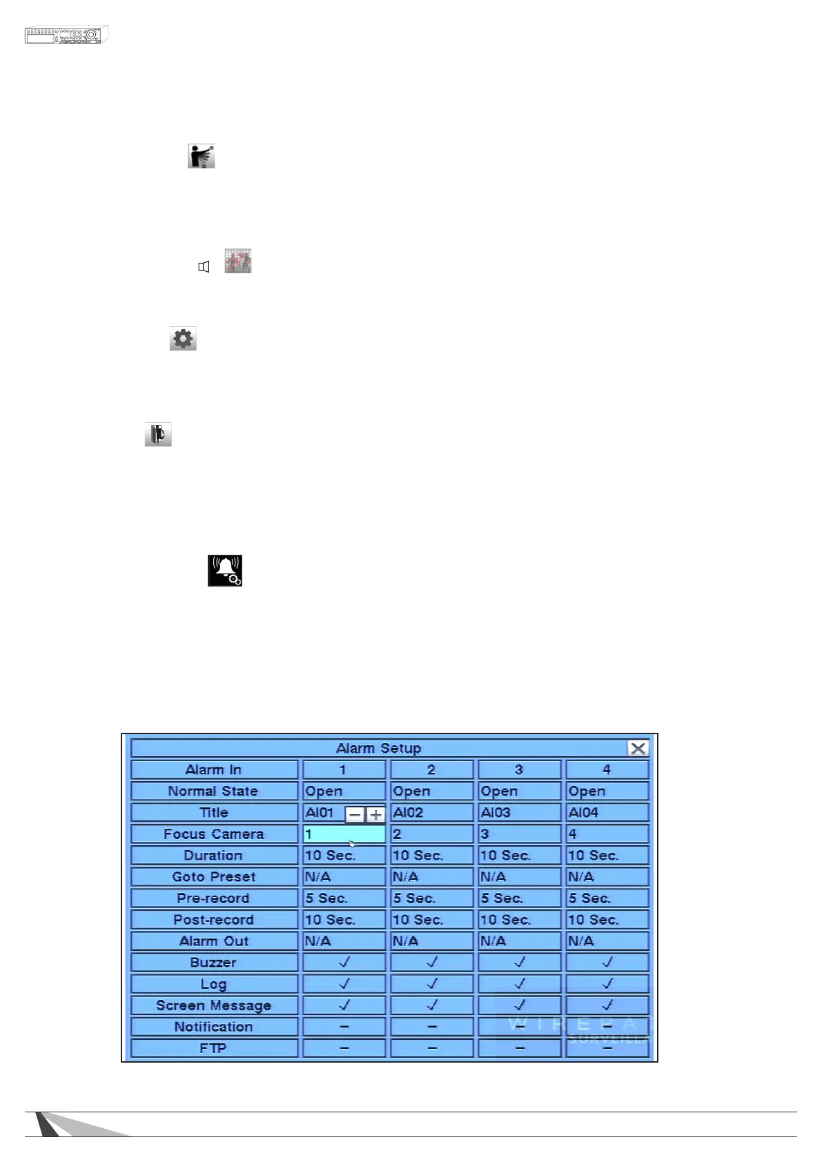 The Alarm Setup allows the administrator to dene the attributes for each alarm input and the actions if it is