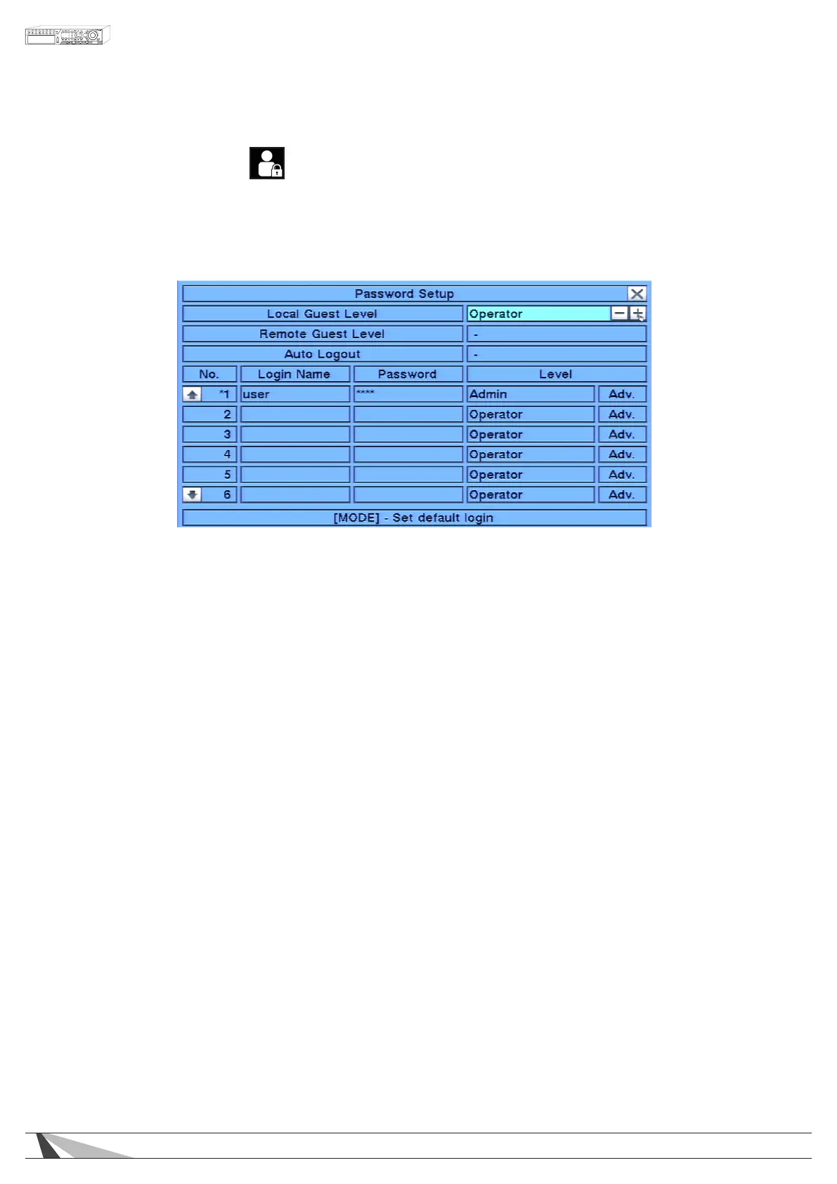 Press the Mode button on the front panel of the DVR or on the remote control to select a user as the default