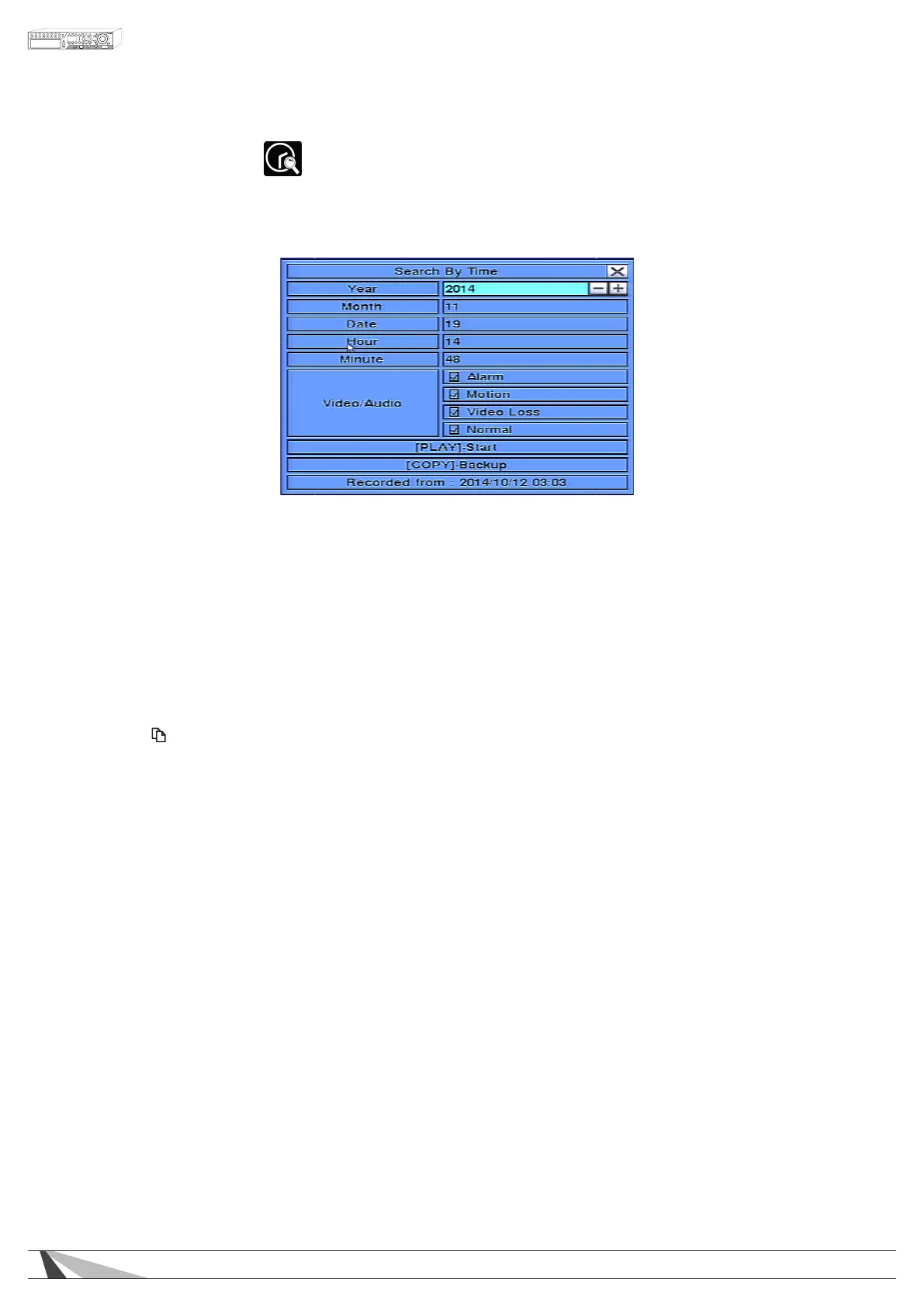 Select the Year, Month, Date, Hour, Minute for the recorded video and audio. Playback (or backup) will