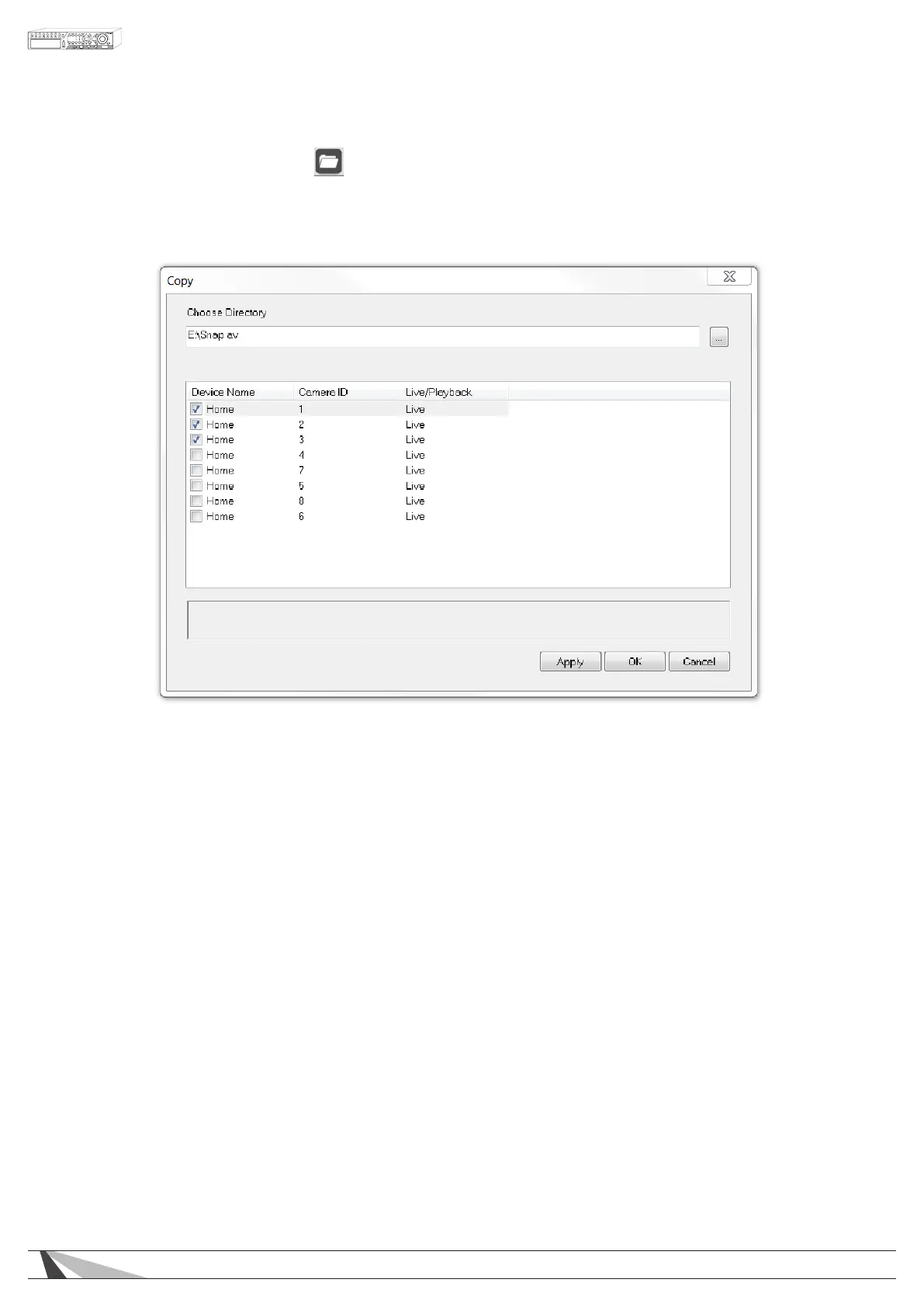 To stop the Copy feature, uncheck the appropriate cameras and select the Apply button.