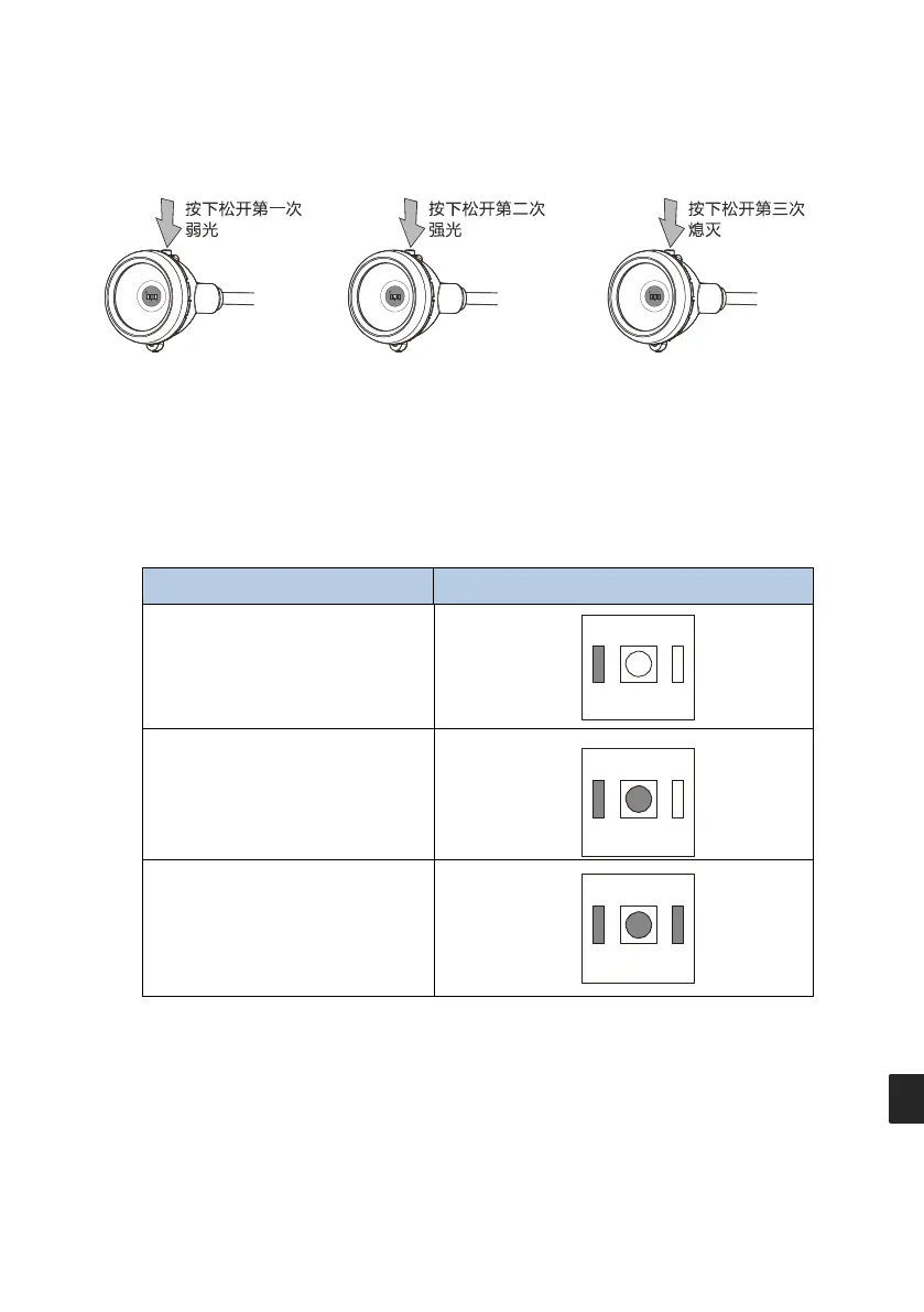 在矿灯熄灭的下,长按开关按键超过 2 秒钟,主、副光源的弱光迚行电量指示。 LED 在电量