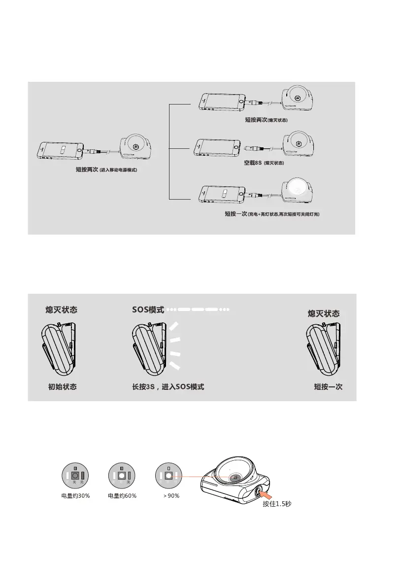 在熄灭状态下,短按两次(0.3s 内)开关即可进入移动电源模式,此时可以给手机等设备充电,