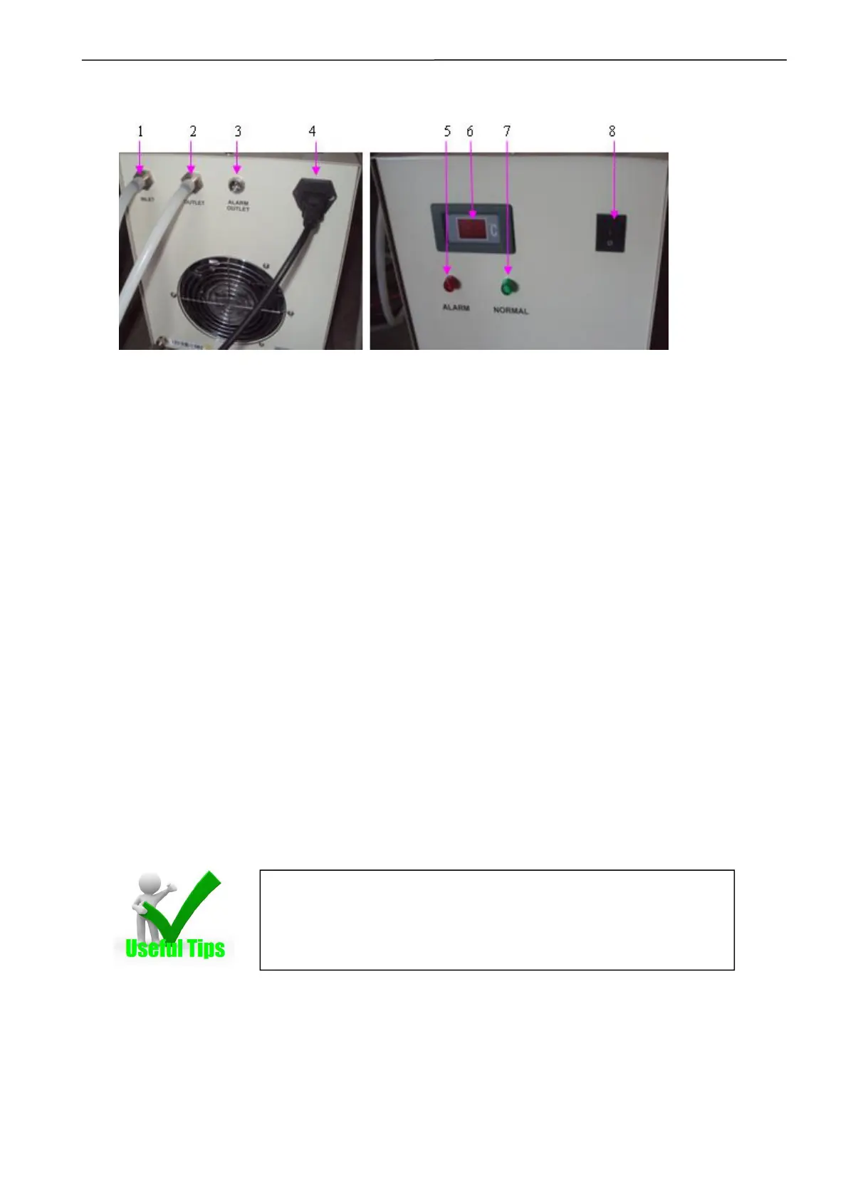 2.Output of the water chiller, usually connected with the inlet of the machine;