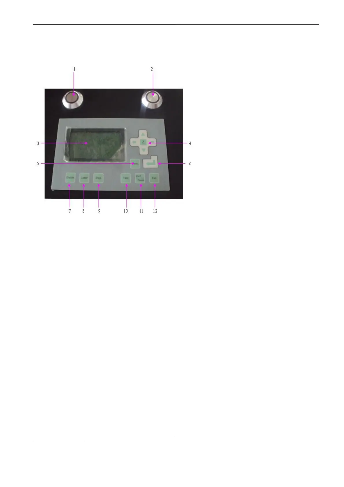 11. Pause: will stop the laser head temporary while working; will go on work after press “Start”;