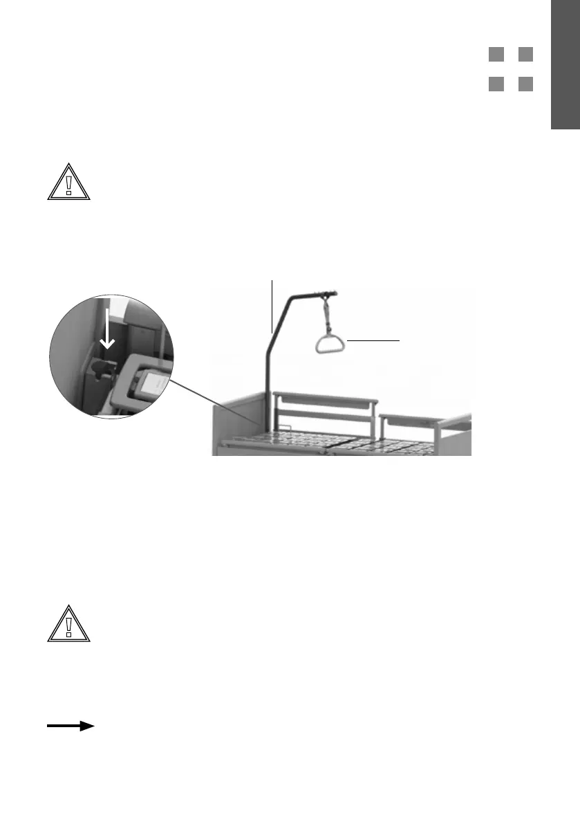 ▪ Hängen Sie den Haltegriff mit dem Gurt an den Patientenaufrichter.