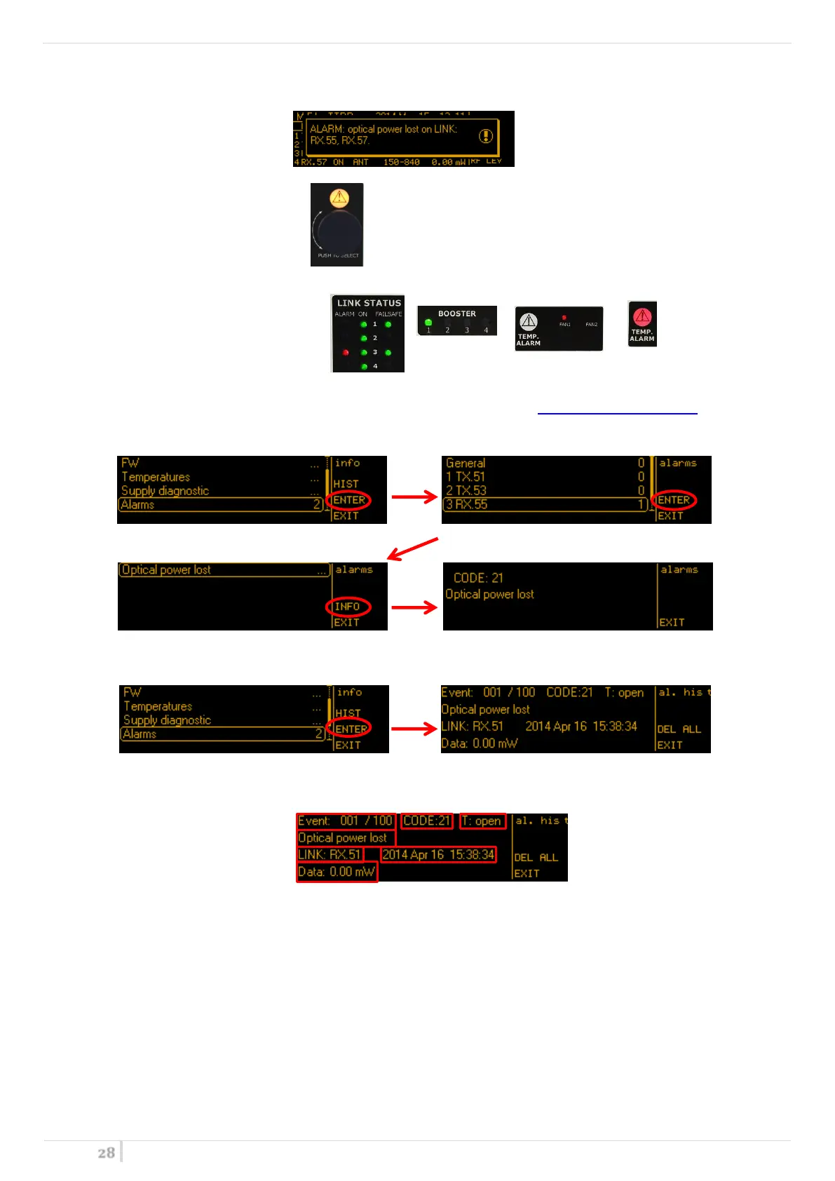 D. Insert the alarm on the current alarm list and in the “history” alarm list (in MAIN>Info>Alarms menu)
