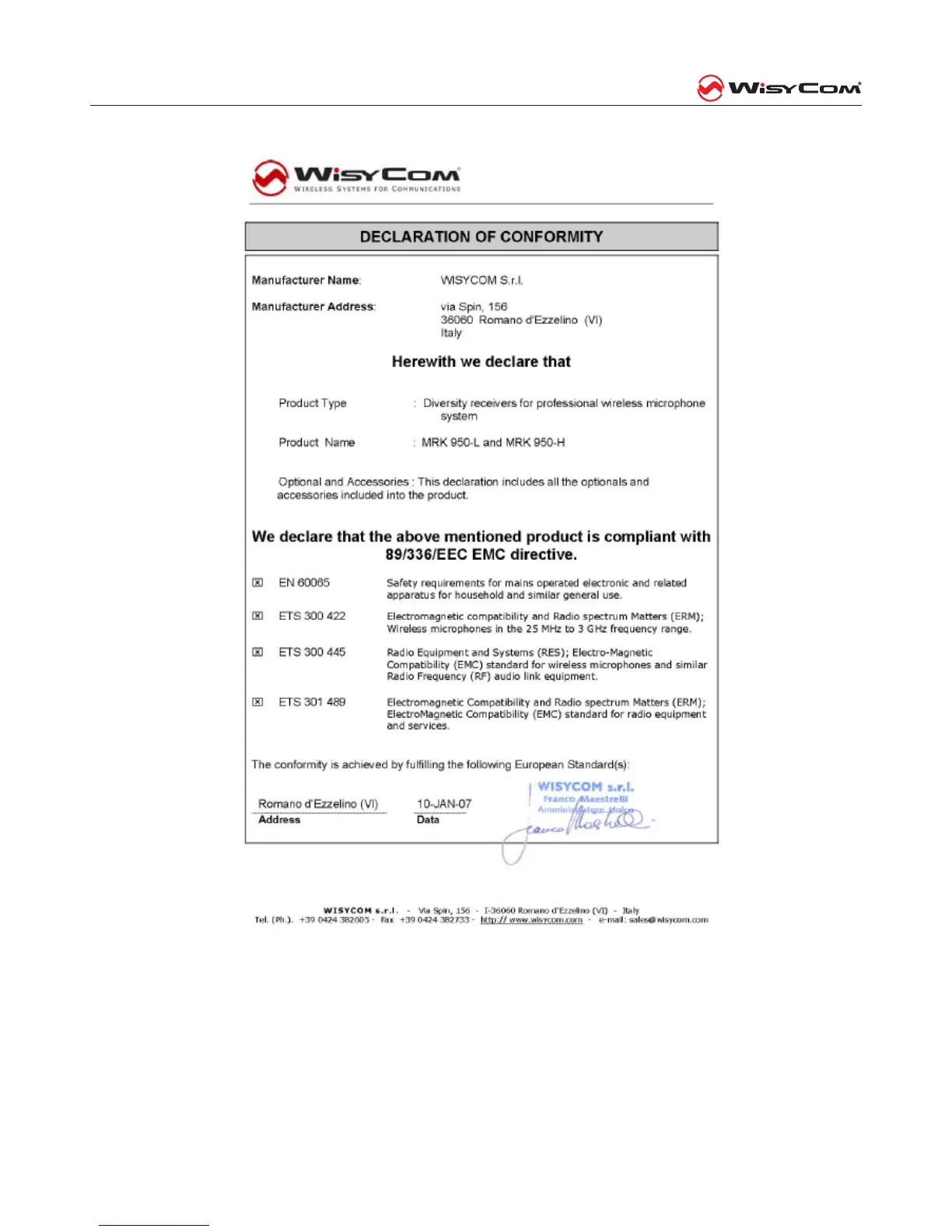 WisyCom MRK 950 EX - Declaration of Conformity; Manufacturer and Product Details; Compliance Standards and Statement