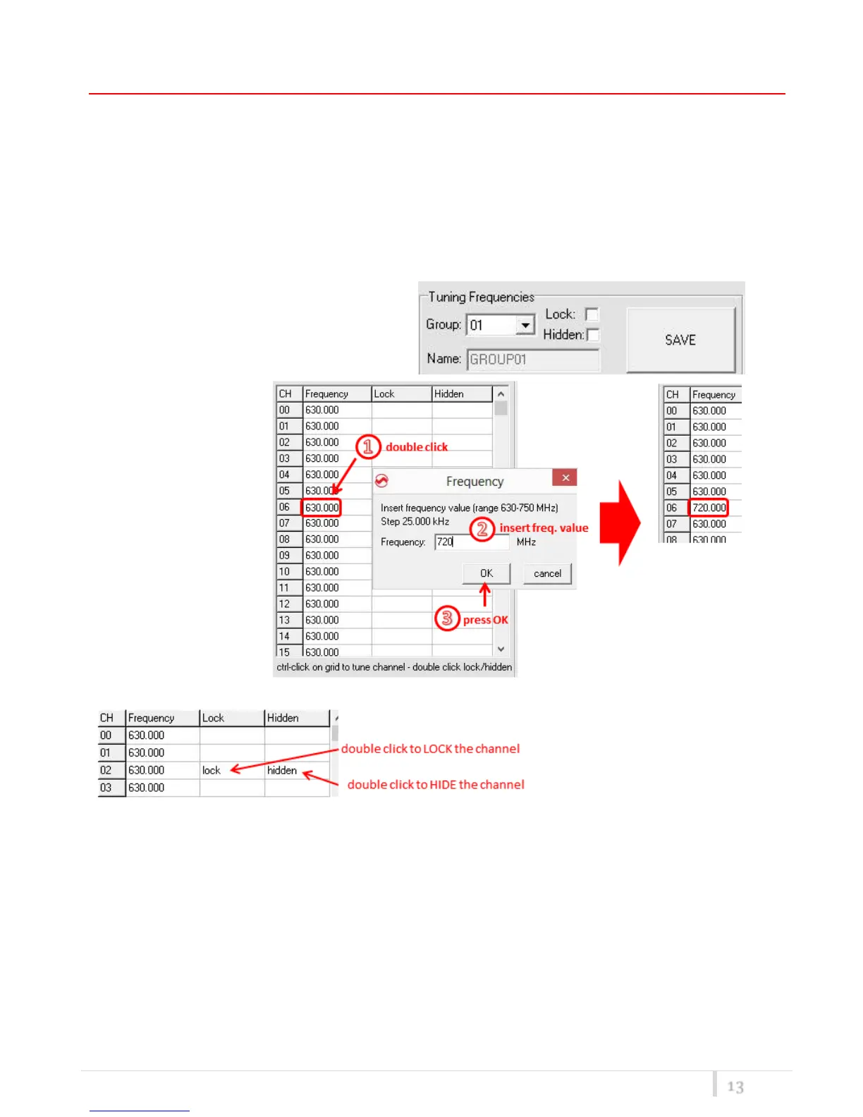 - for each channel (0 ÷59) of the selected group: change the frequency value and the