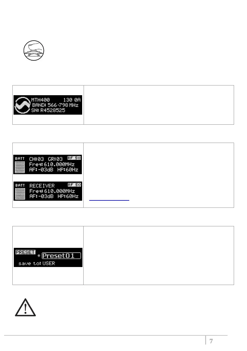 - Current channel/group (i.e. CH:03 GR:03) or Receiver’s name