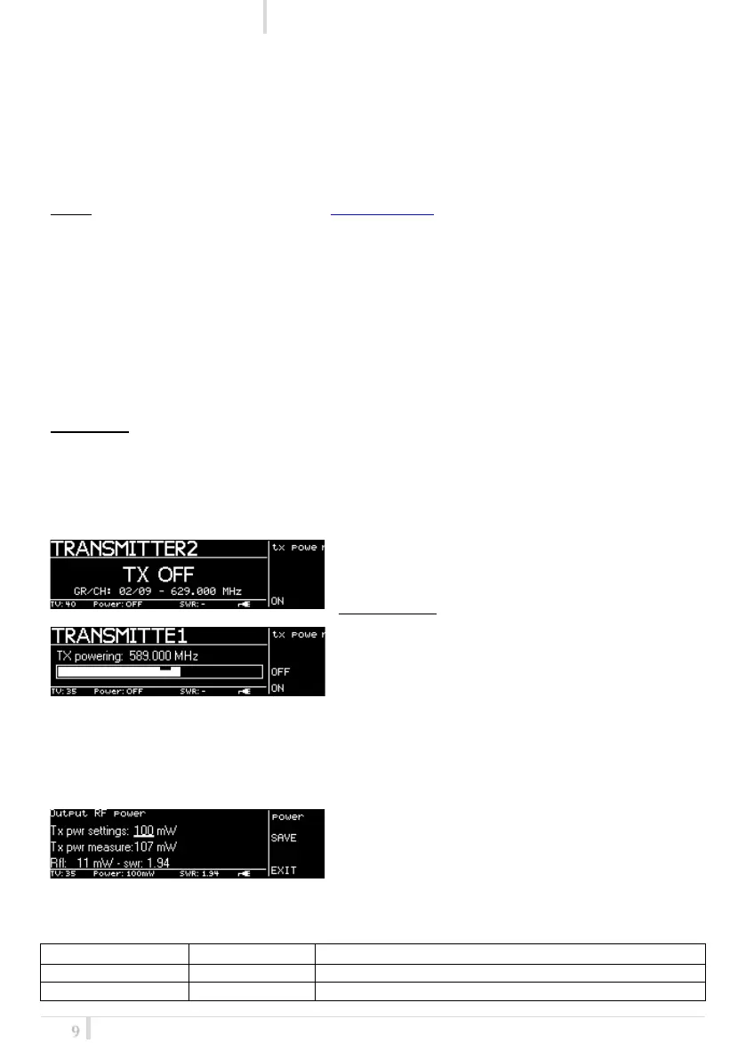 This menu allows to set the power of the transmitter. Rotating the knob it is possible to change