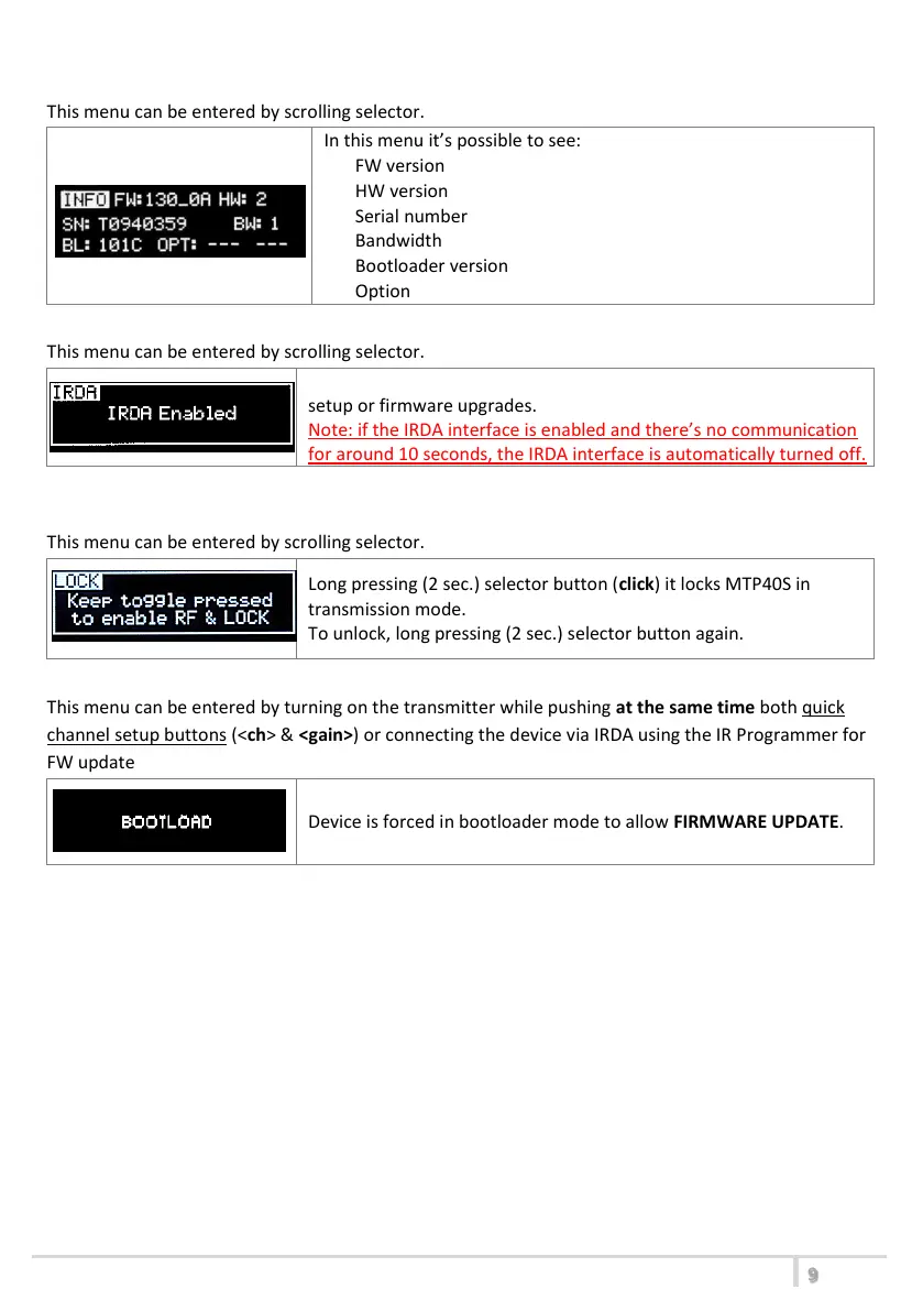 channel setup buttons (<ch> & <gain>) or connecting the device via IRDA using the IR Programmer for