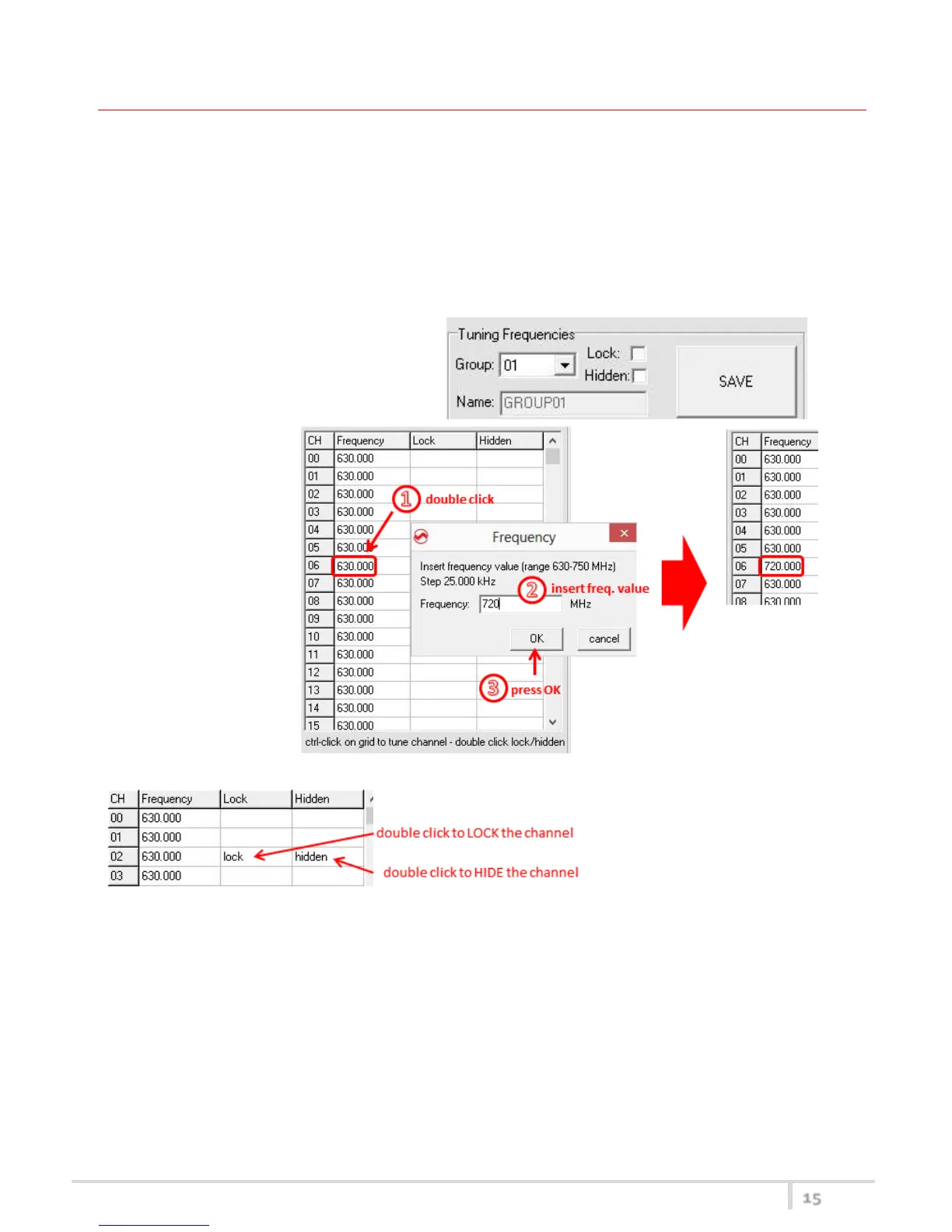 - for each channel (0 ÷59) of the selected group: change the frequency value and the