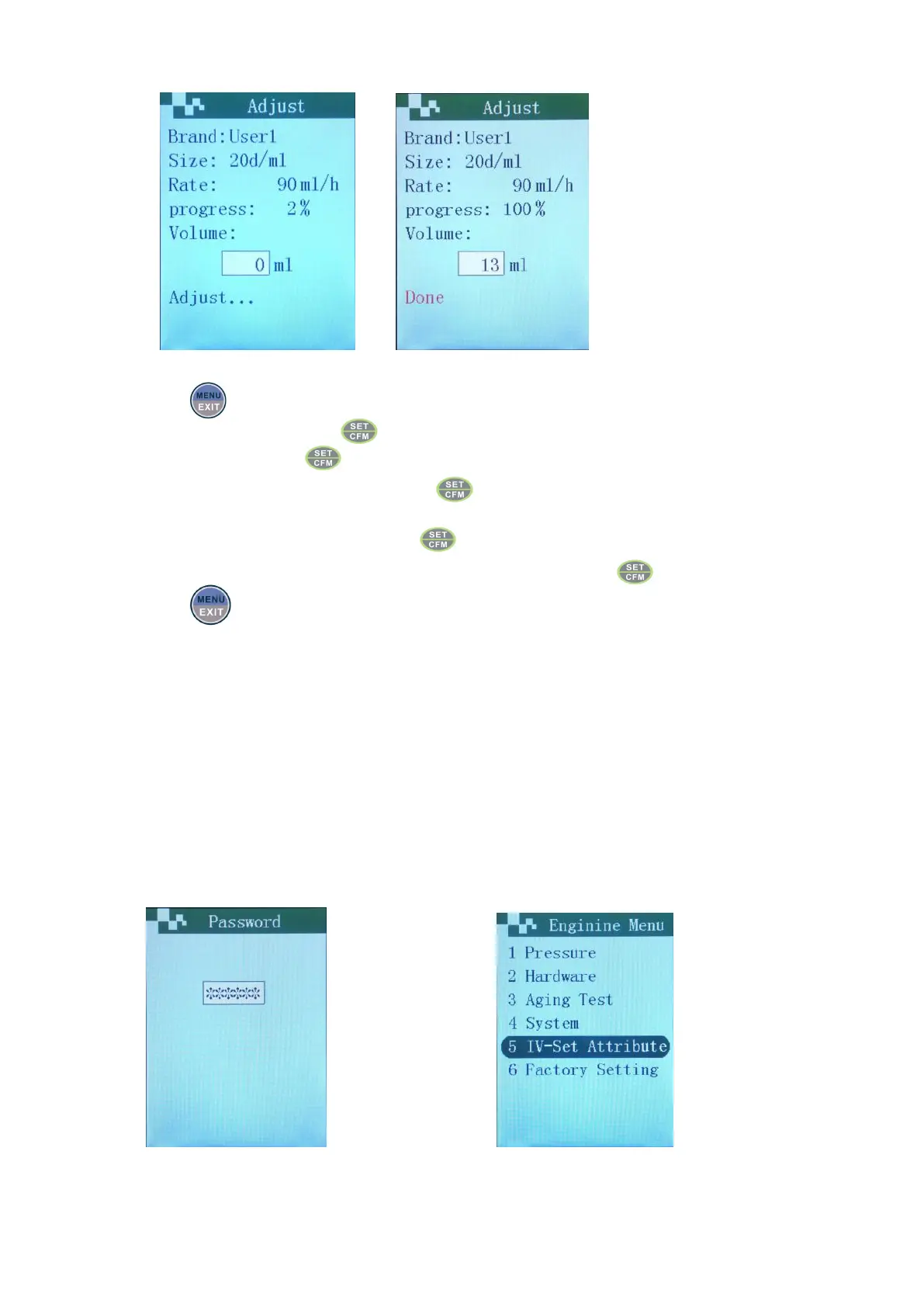 Choose “IV Set” menu, press .