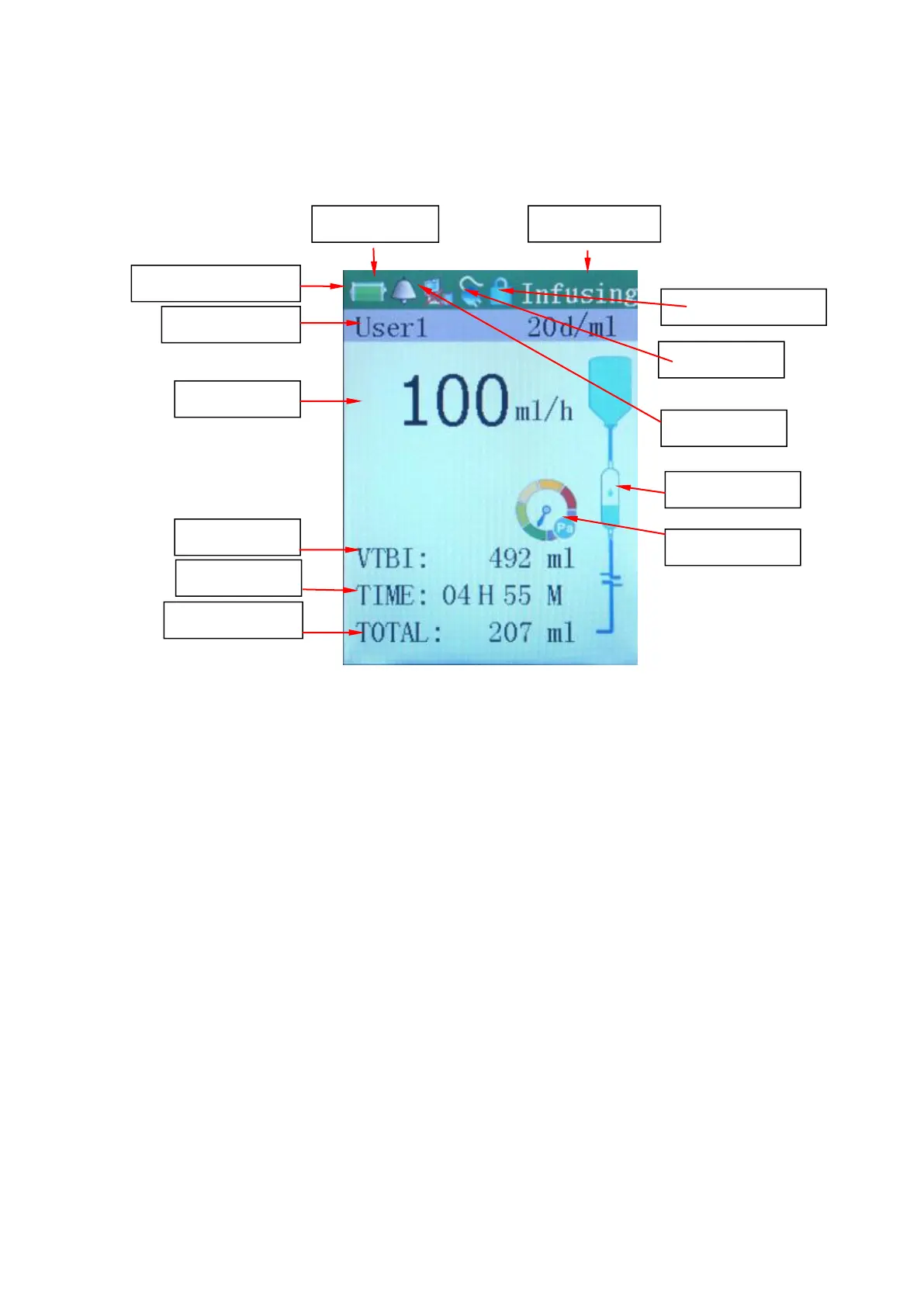 icon, infusion status icon, pressure status icon, IV Set brand, specification, and fluid warmer