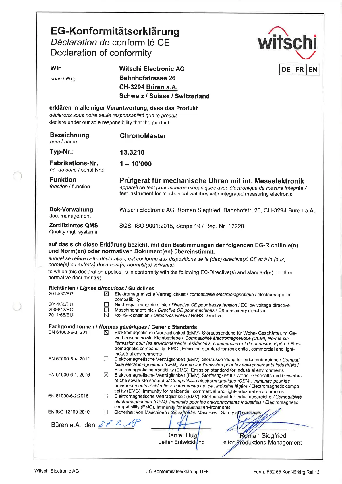 Witschi ChronoMaster - Declaration of Conformity; CE Declaration for ChronoMaster