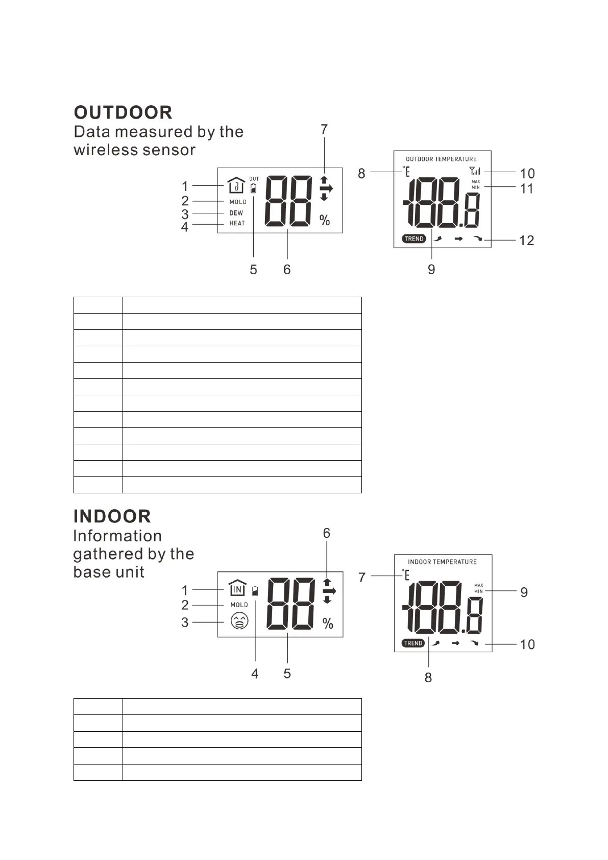 Wittime WT2022A - Outdoor Measurement Display; Outdoor Data Indicators; Indoor Measurement Display; Indoor Data Indicators