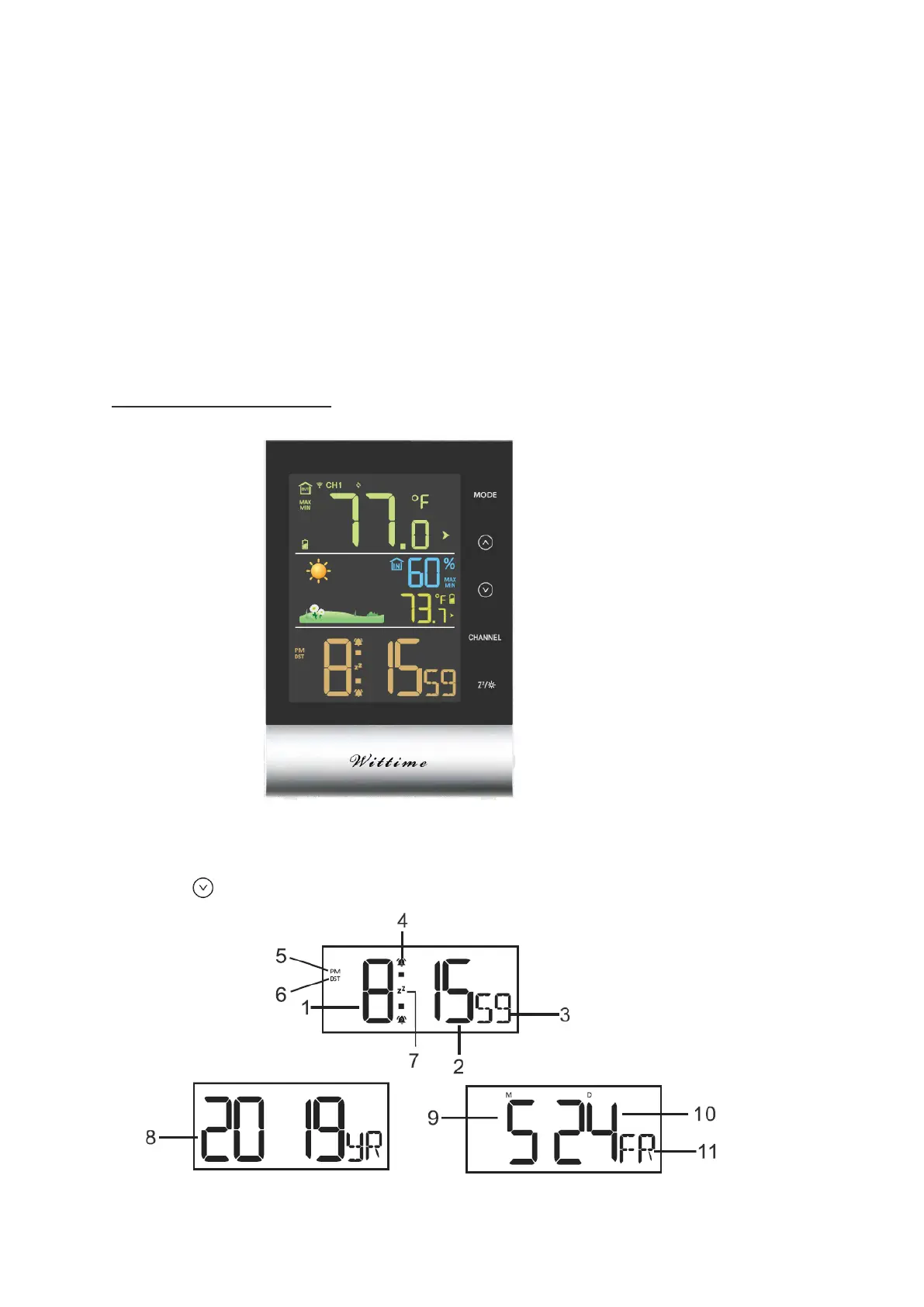 Press the button to switch: Time, year, month, date and day of week display.