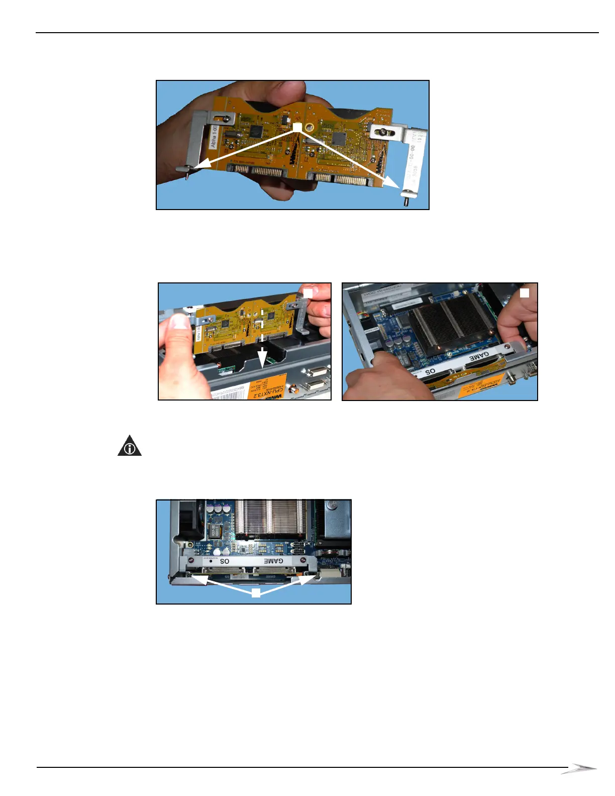 Figure 3-34 Hold edges of PATA Board bracket (left) and lift board and bracket onto CPU (right).