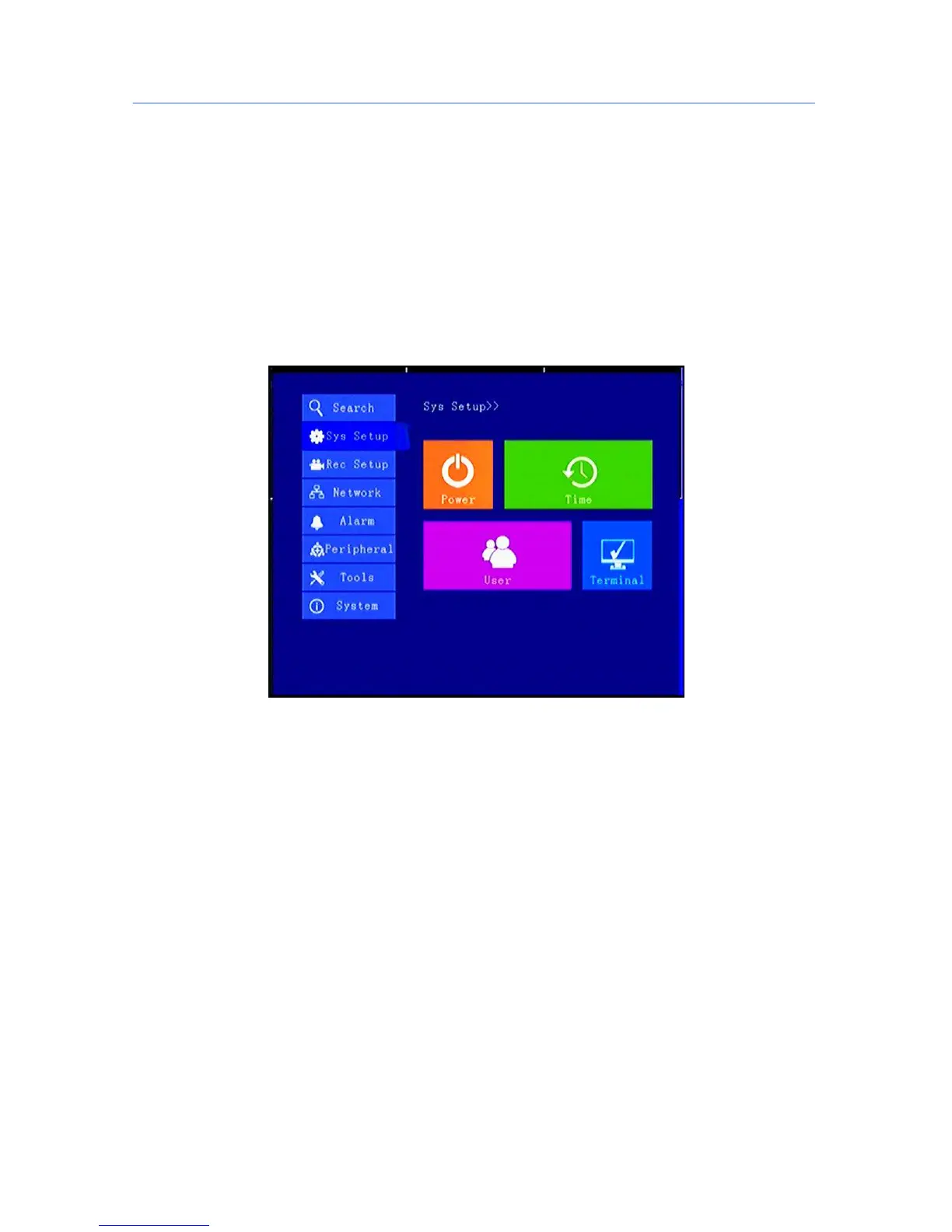 Under System Setup menu includes: Power, time setup, user setup, terminal setup (menu setup and