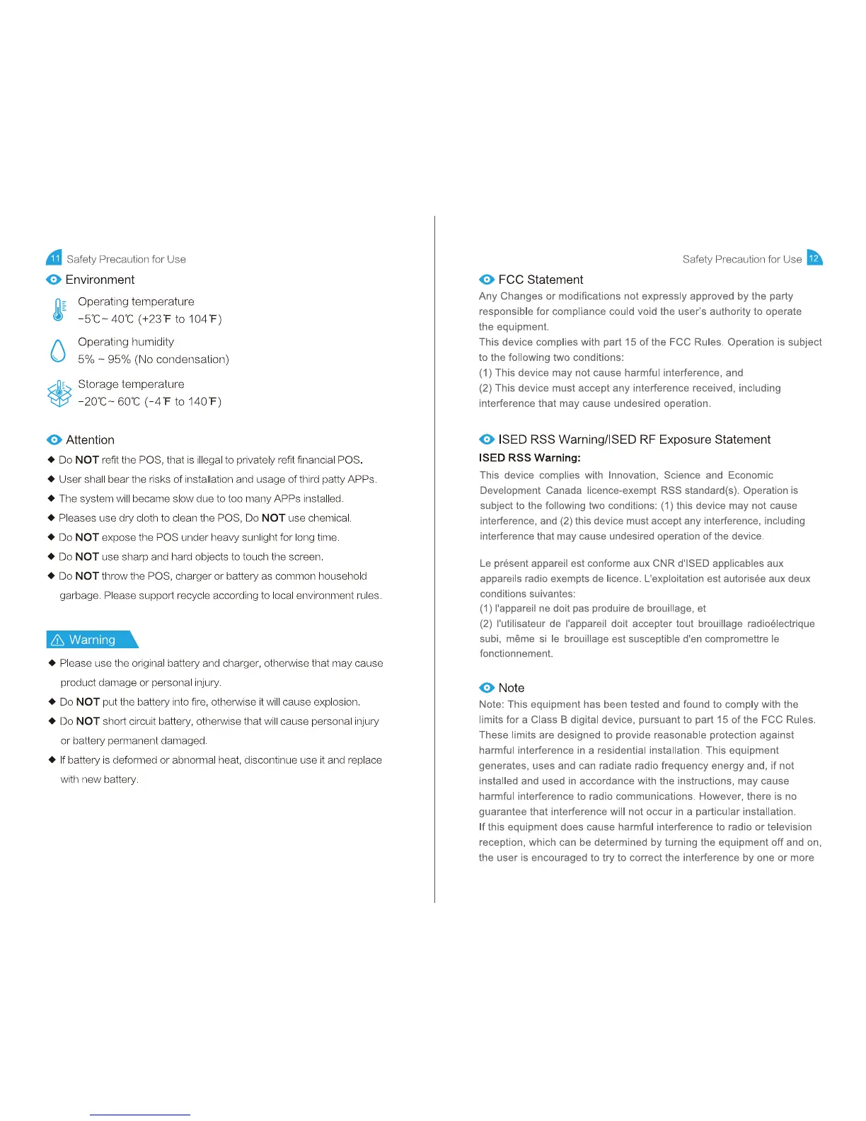 WizarPOS Q2 - Attention; Warning; Safety Precaution for Use; FCC Statement