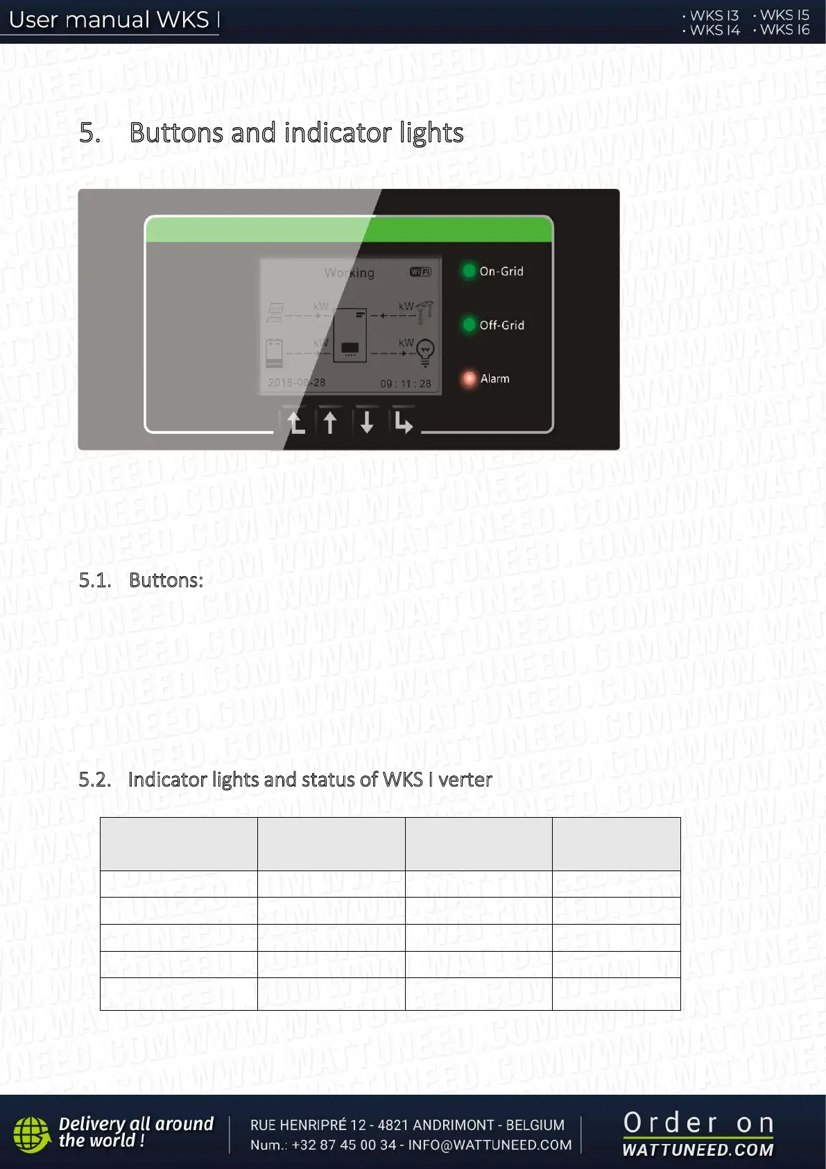 WKS i3 - Buttons and Indicator Lights; Buttons; Indicator Lights and Status of WKS I Inverter