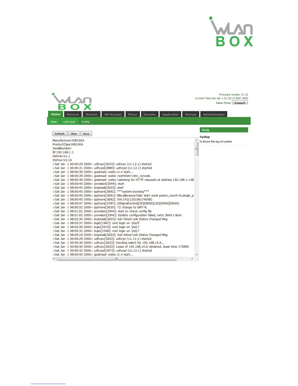 In this configuration page, the user can view the system log, WB100A system recordings contain