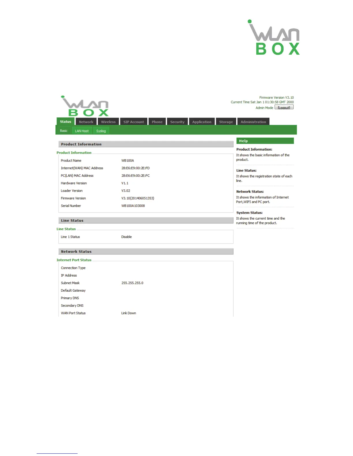 On this page, user can view the product information of WB100A, SIP account status, network