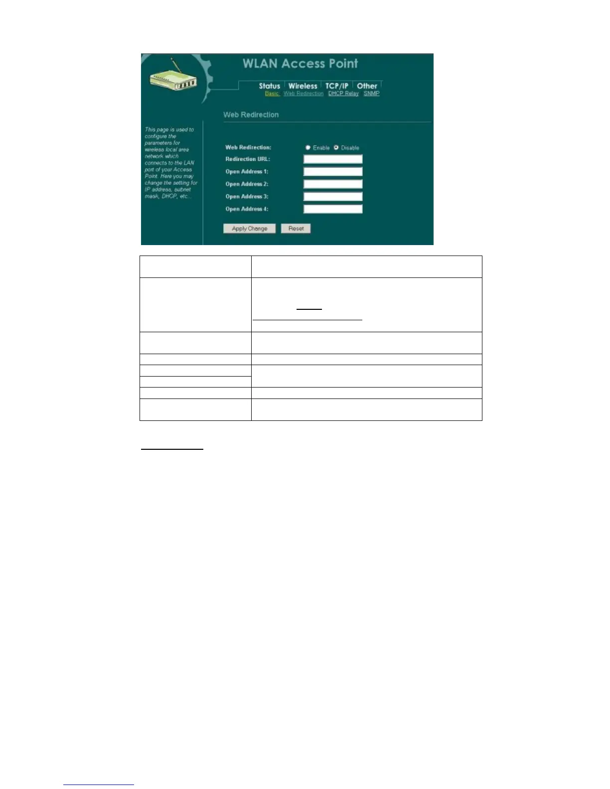 enable/disable the function of “Web Redirection”.