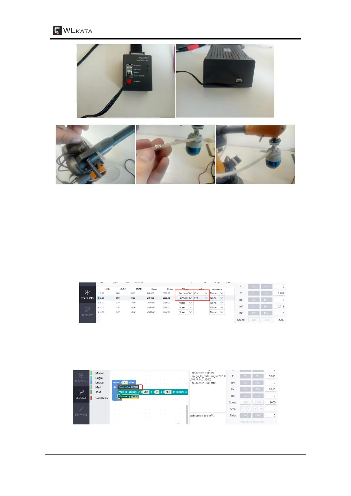 • In the BLOCKLY page, control the pneumatic tool by drag and edit the Suction Cup