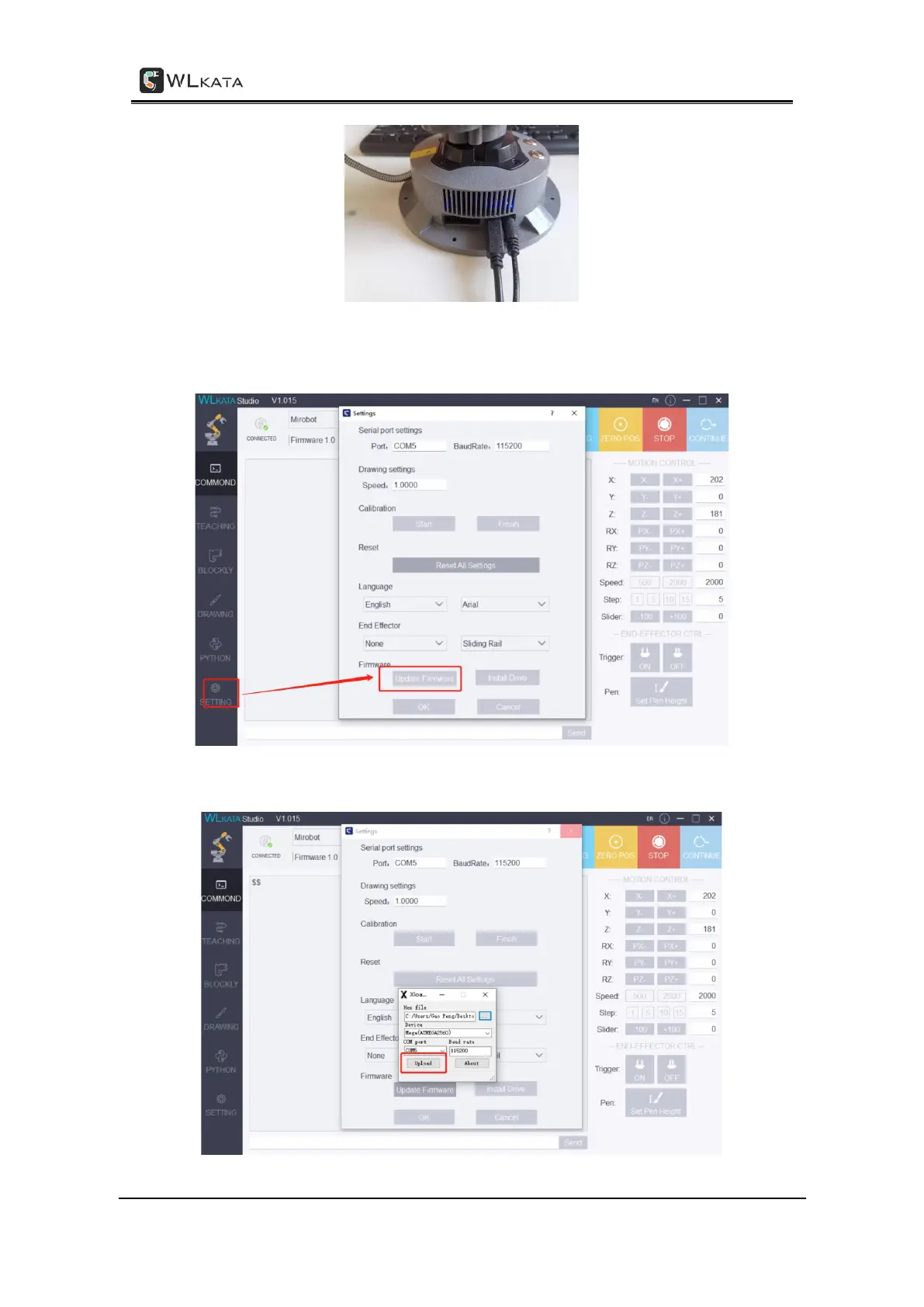 Step 2: Open the WLKATA Studio software, enter the "Settings" interface, and click "Update