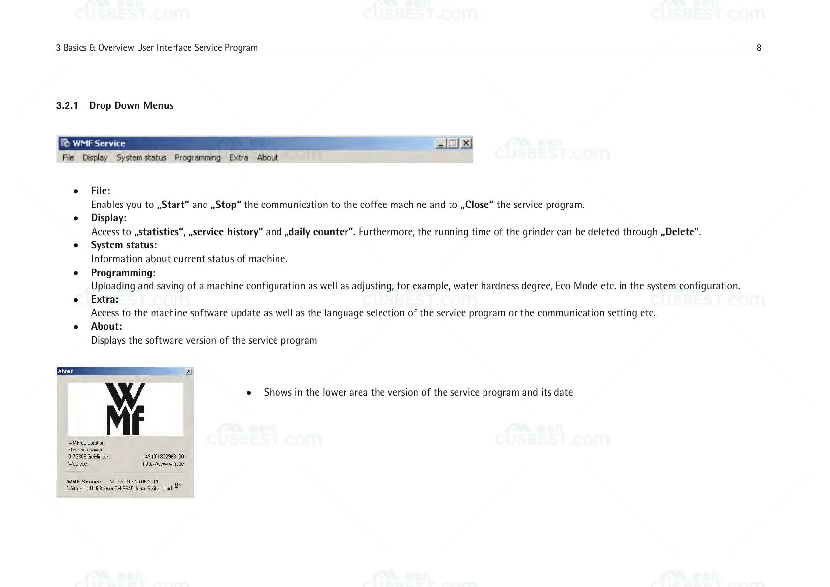 Enables you to „Start“ and „Stop“ the communication to the coffee machine and to „Close“ the service program.
