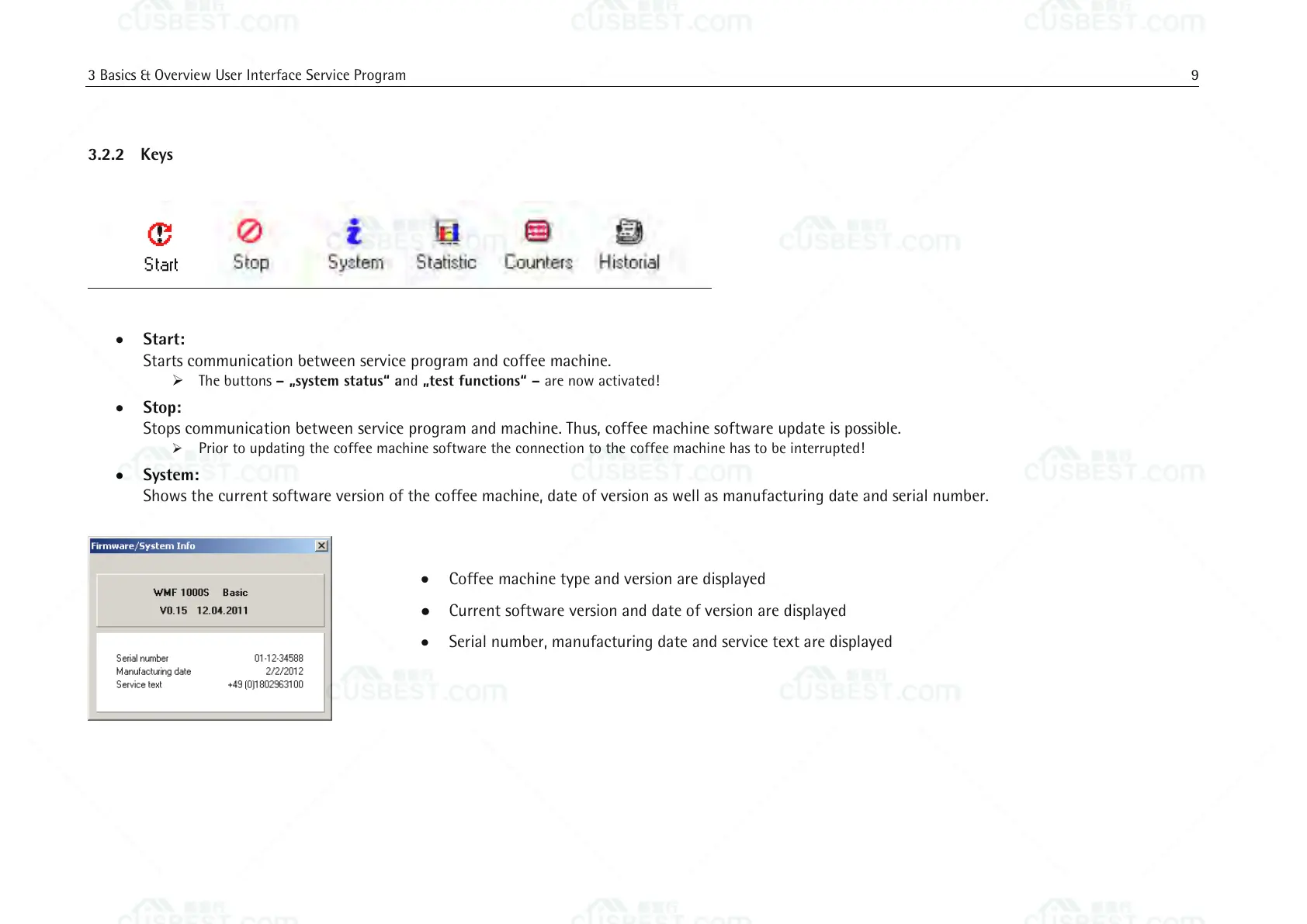 Shows the current software version of the coffee machine, date of version as well as manufacturing date and serial number.
