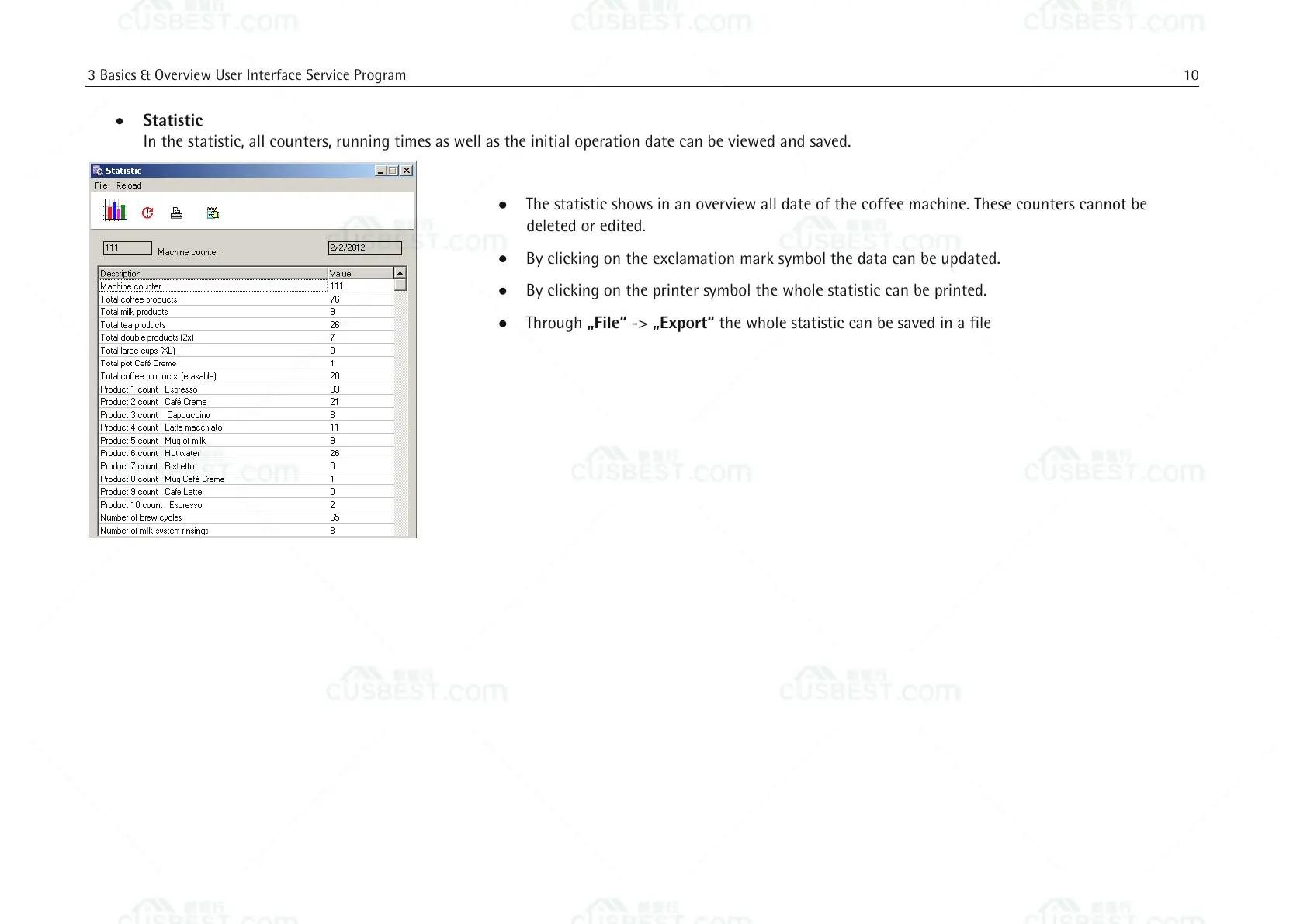 The statistic shows in an overview all date of the coffee machine. These counters cannot be
