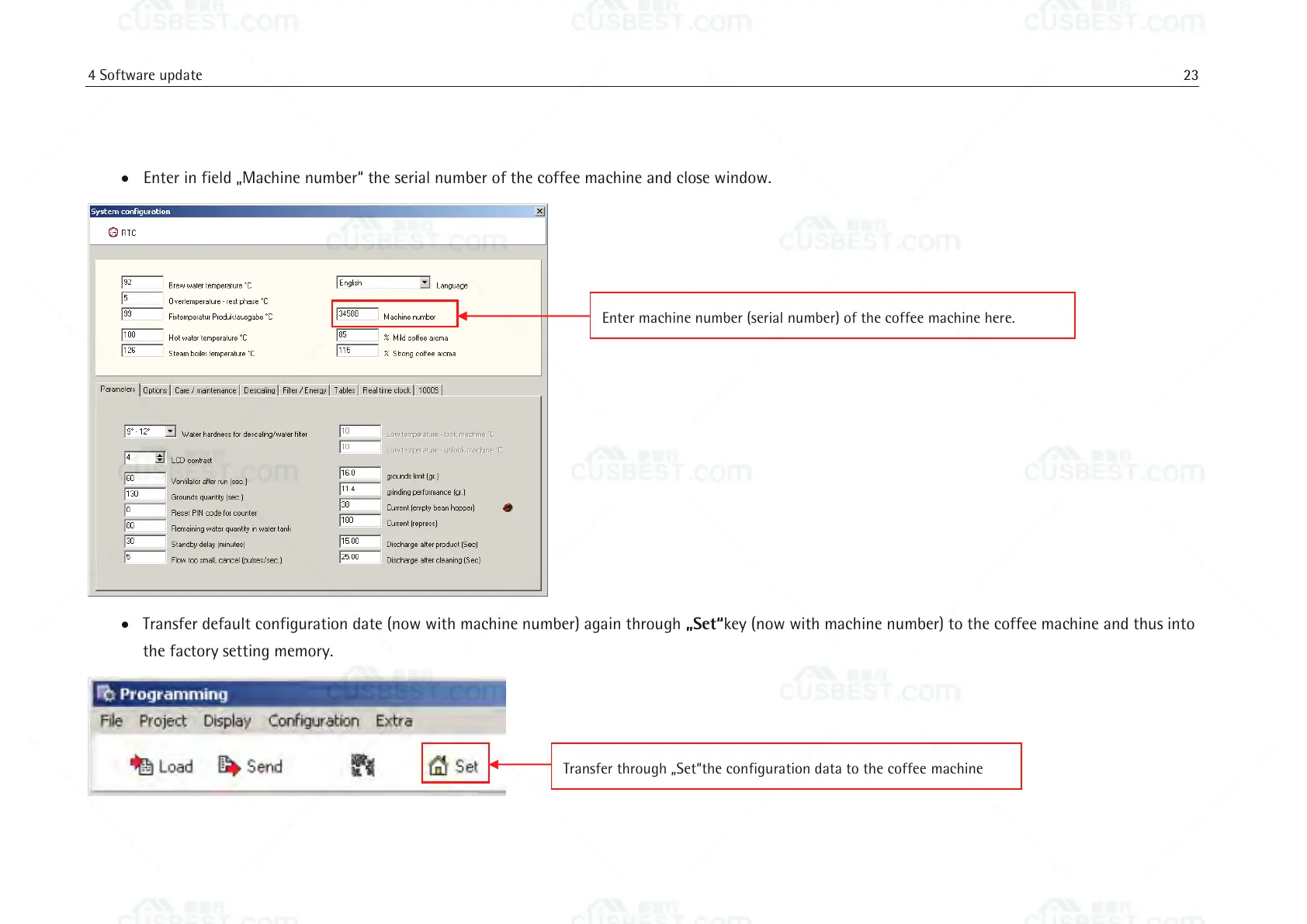 Transfer default configuration date (now with machine number) again through „Setkey (now with machine number) to the coffee machine and thus into