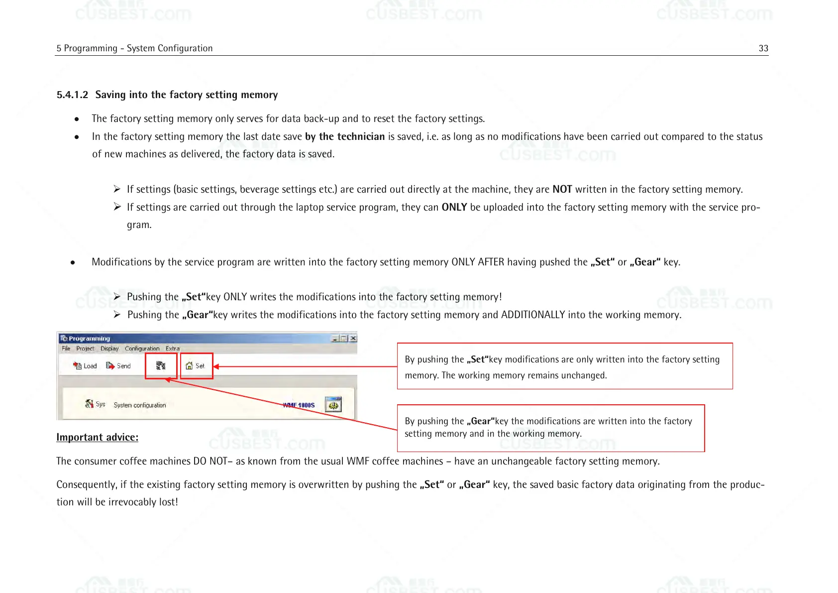 Consequently, if the existing factory setting memory is overwritten by pushing the „Set“ or „Gear“ key, the saved basic factory data originating from the produc-