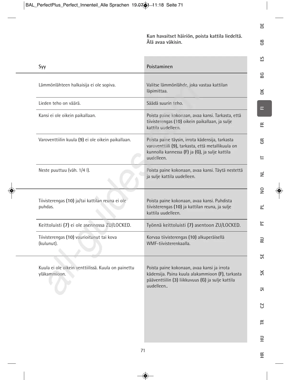 Poista paine kokonaan, avaa kansi. Tarkasta, että