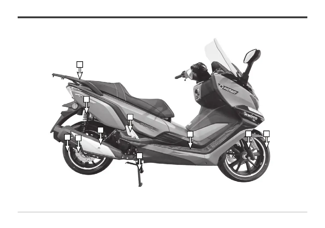 1. Rear armrest 2. Rear shock absorber 3. Rear wheel 4. Rear disc brake 5 Silencer