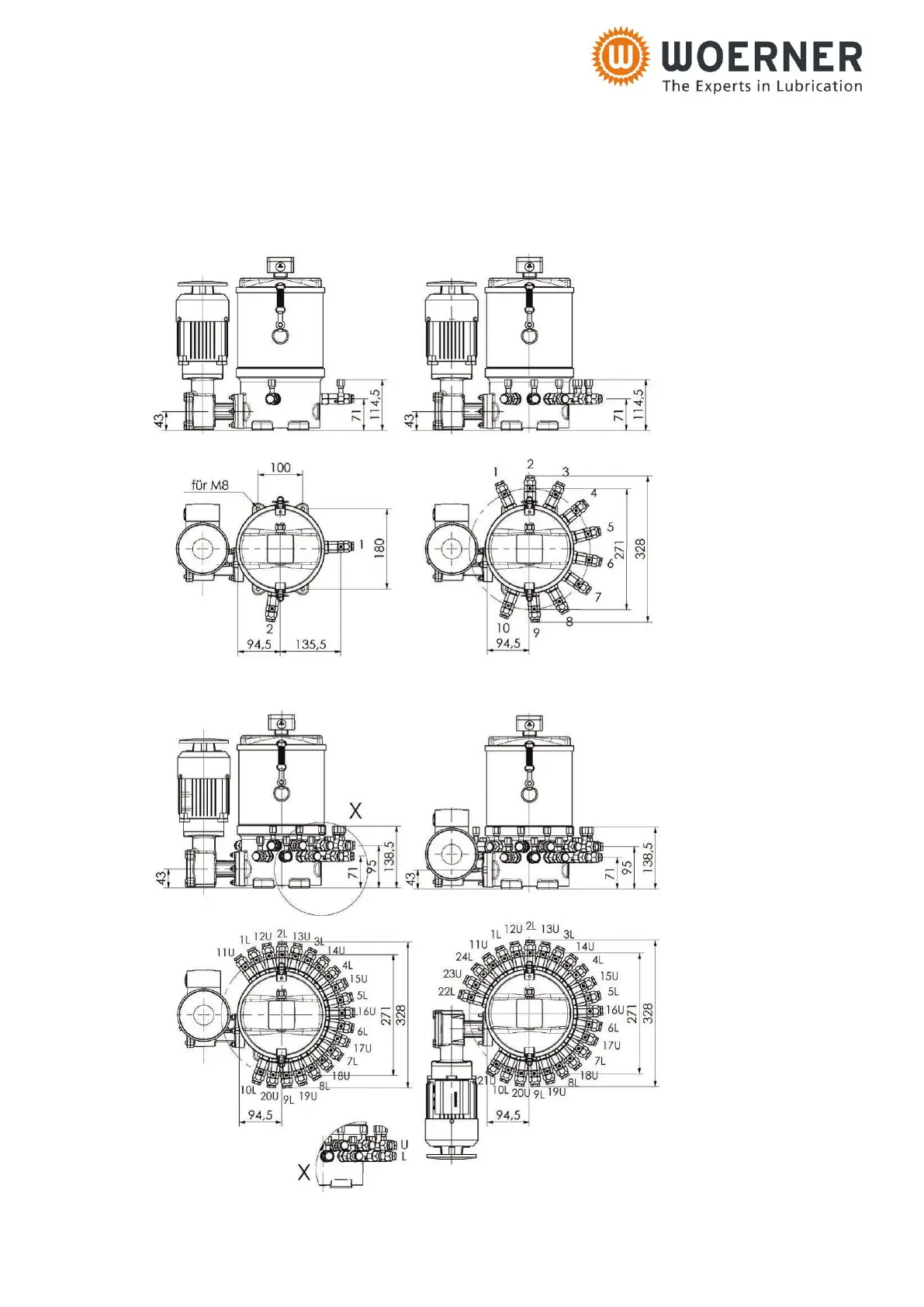 The following drawings depict the dimensions of the multi-outlet pump unit GMF. The