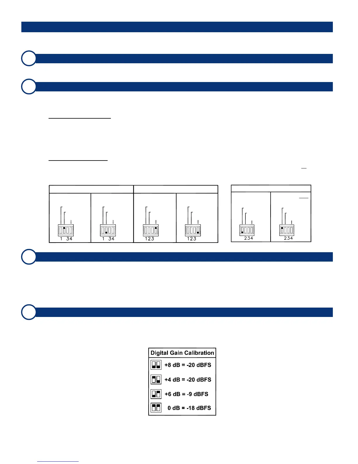 Input Level Gain Calibration, the analog level which corresponds to a given digital input value, is settable via this DIP