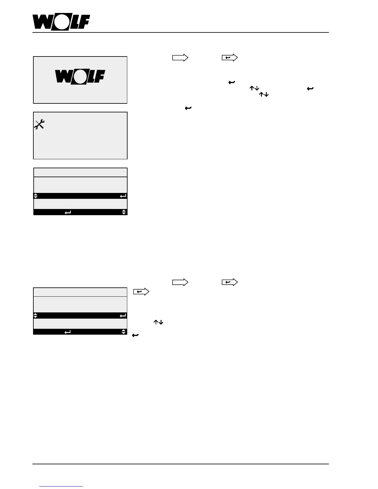 The Wolf logo will be displayed. Pressing prompts entry of the heating contractor