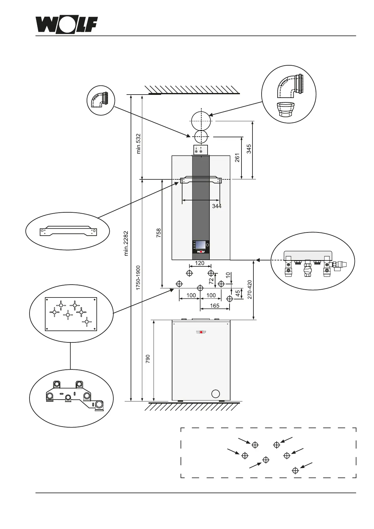 Wolf CGB-2K-20 - Installation Dimensions and Connections; Boiler Mounting and Connection Points