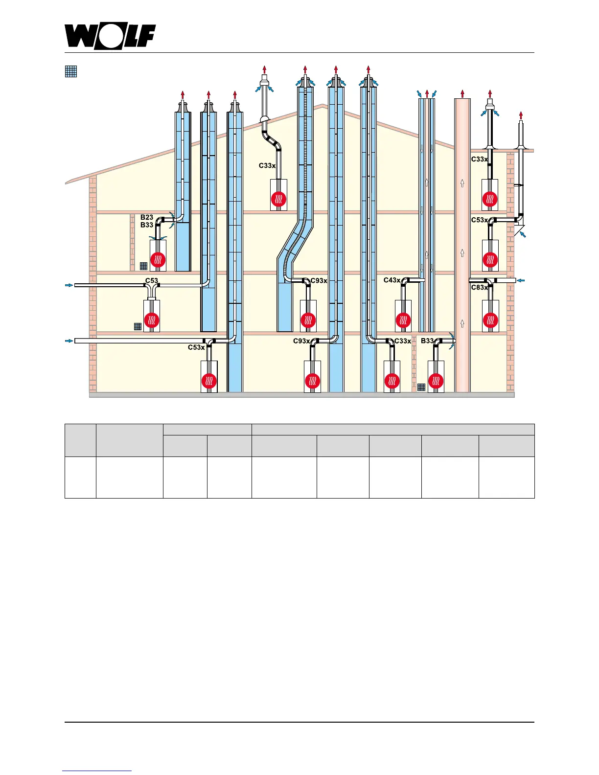 For types B23 and B33, the combustion air is drawn from the installation room (open ue combustion equipment).