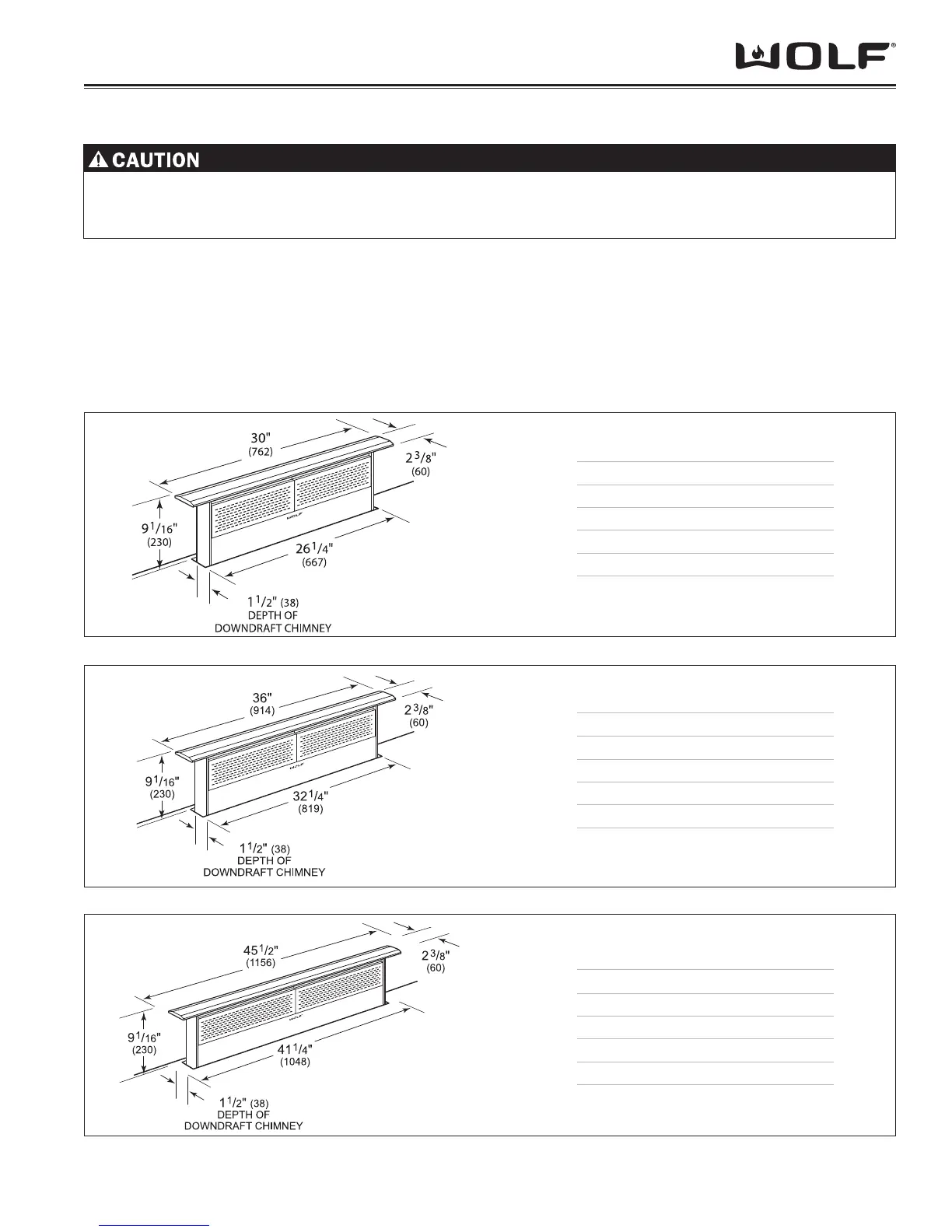Wolf downdraft ventilation systems are available in 30” (762), 36” (914) and 45-1/2”(1156) widths. The downdraft