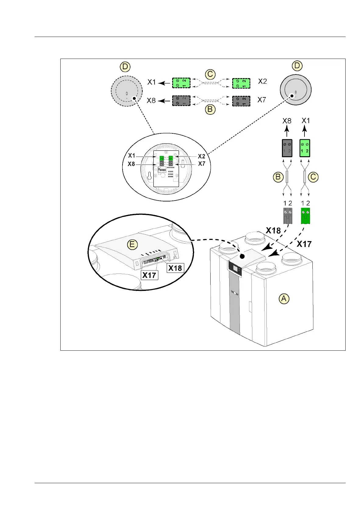 E = Connection X17 (eBus) and X18 (24V) on CWL appliance