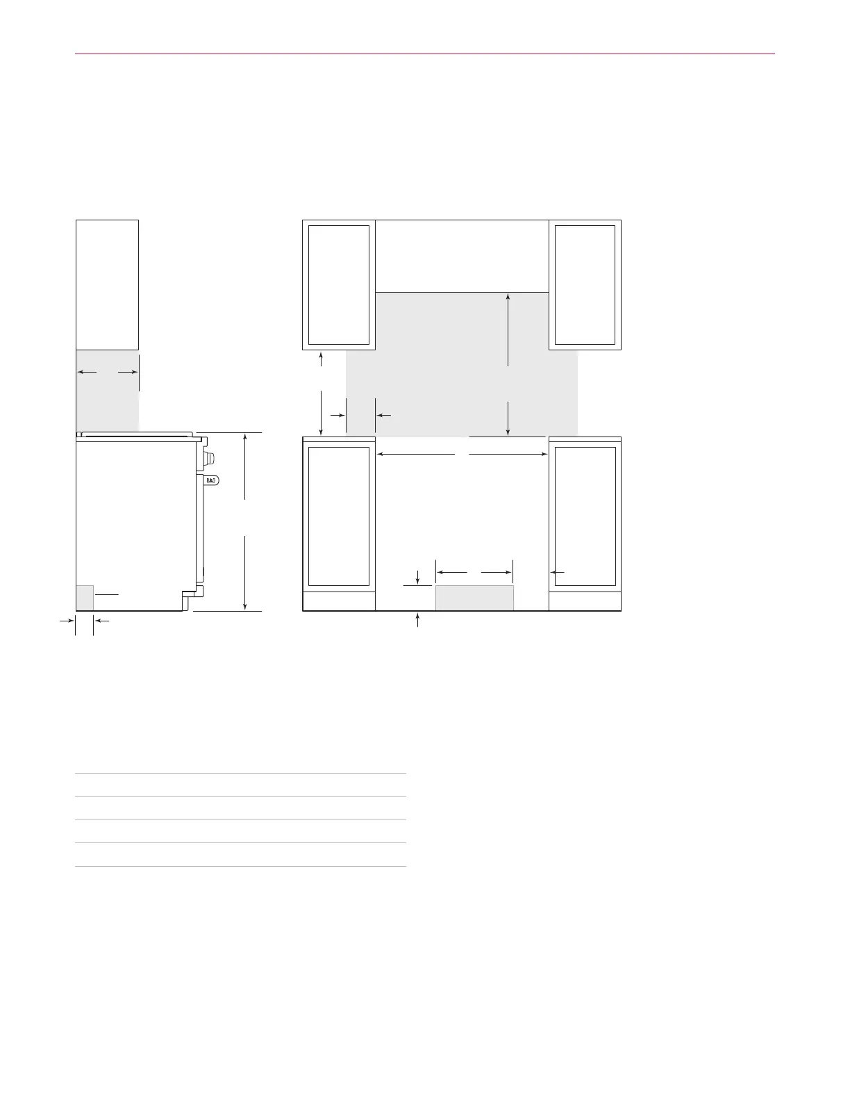 NOTA: La zona sombreada sobre el mostrador indica la distancia mínima a las superficies combustibles, los materiales combustibles