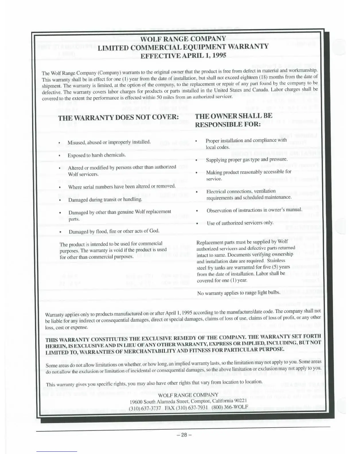 Wolf PACIFIC SERIES - WARRANTY INFORMATION; WARRANTY COVERAGE EXCLUSIONS; OWNER RESPONSIBILITIES